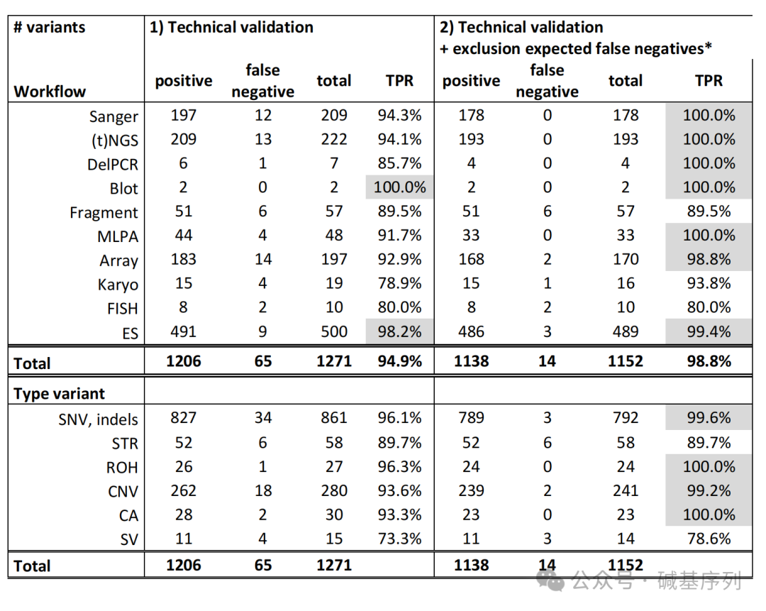 • 运用了两种敏感性分析方法评估GS。首先,通过计算各分析工作流程的真阳性率(true positive rate, TPR)来衡量敏感性。TPR定义为检出的真阳性变异数(true positives, TP)与变异总数的比值,同时计算假阴性的数量(false negatives, FN)。其次,为了更准确地估计TPR,排除那些在30×GS中未能成功检测到变异(62个病例的123个变异),然后再进行分析。通过这种方法,可以排除那些已知在常规条件下检测困难的变异,从而获得一个更接近真实情况的TPR。