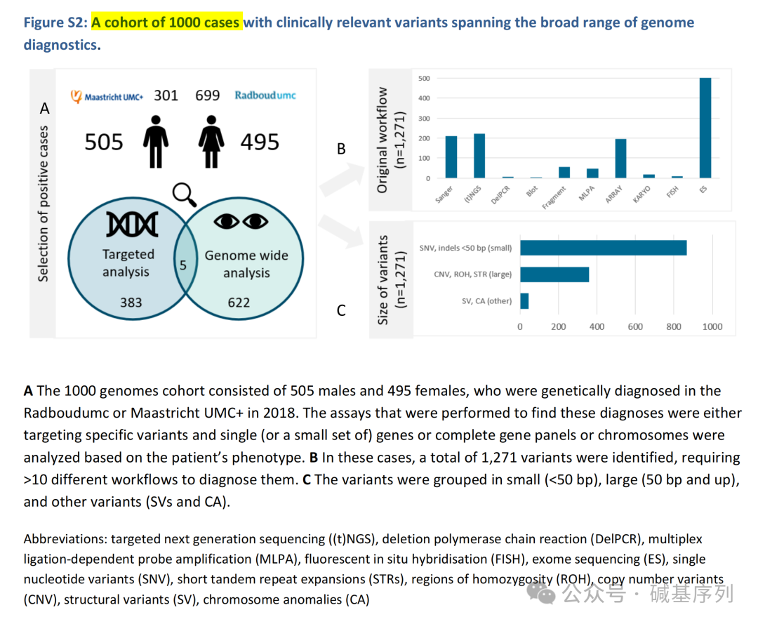 共鉴定出1271个与疾病相关的变异,分为三大类:第一类为小的变异(n=860),如SNVs、不超过50个碱基对的indels;第二类为结构变异(n=366),如CNVsSTRs第三类为其他类型的变异(n=45),如SVs、染色体异常(CAs)。