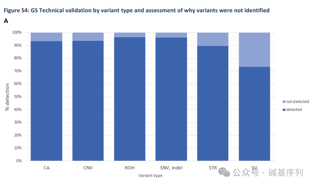 任何技术都有其局限性。在这里,GS未检测到5%(65/1271)的变异。例如,在高度同源区域。测序深度大约30×的短读长GS在检测嵌合性变异时也会遇到困难。然而,从短读长的数据中恢复这些变异的解决方案也是有的:对于嵌合性变异,增加GS测序深度;而生物信息学算法优化有助于检出位于复杂的同源的基因组区域的致病变异。例如,在分析中成功使用了针对SMA和CYP21A2位点的算法,还开发了识别同源区域变异的工具。因此,在本研究中,检出了预期认为可能无法通过30×GS检测的119个变异中的68个。例如,位于高度同源区域基因(STRC和OTOA)的变异、嵌合状态的变异(比例> 14%)。