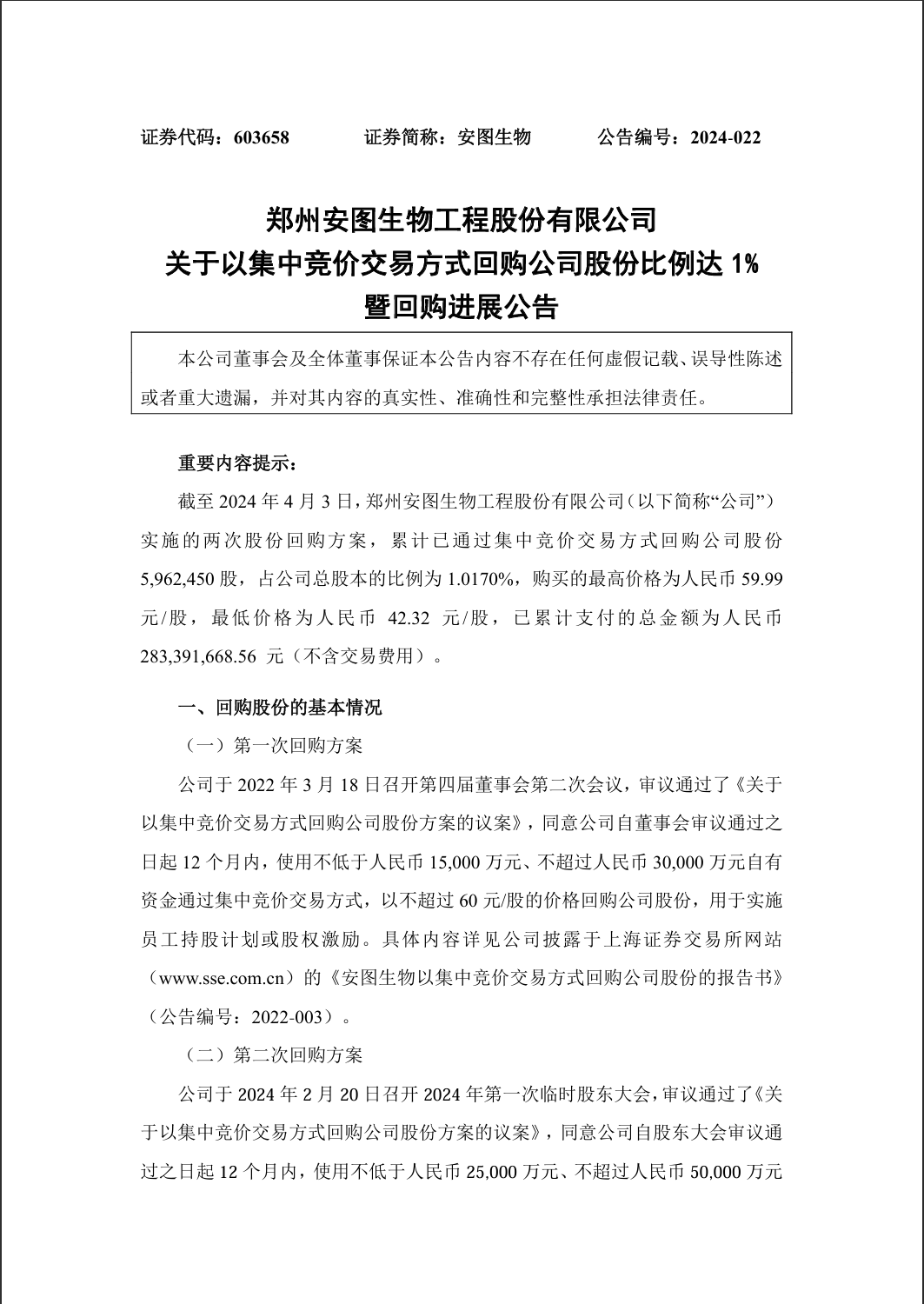 安图生物4月8日发布公告,截至2024年4月3日,公司所实施的两次回购方案,累计已通过集中竞价交易方式回购股份5,962,450股,占公司总股本的比例为1.0170%,成交的最高价为59.99元/股、最低价为42.32元/股,累计已支付的总金额为283,391,668.56元(不含交易费用)。