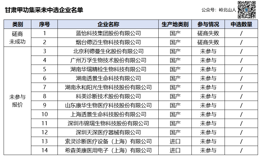 4月10日,甘肃省医保局发布了关于公示甲状腺功能检测试剂集中带量采购中选结果的通知。至此,甘肃省甲状腺功能检测试剂集中带量采购告一段落。按照甘肃省医疗保障局《甘肃省甲状腺功能检测试剂集中带量采购文件(GS-IVDDLCG2024-1)》要求,经过拟中选结果公示、申诉质疑处理,根据甘肃省药品和医用耗材集中采购工作领导小组办公室授权,现对中选结果予以公布。结果执行事宜由省医保局另行通知。甘肃省公共资源交易中心0931-2909192、2909260。本次集采范围覆盖9个试剂品种,包括甲状腺功能检测试剂5种、抗体检测试剂3种、肿瘤检测试剂1种。根据采购文件,共74家企业567个产品符合申报要求。 根据2023年1月1日-2023年12月31日医疗机构甲状腺功能检测试剂采购品种的历史配送量,得出首年意向采购量。从首年意向采购量来看,整体需求量在900万人份左右,而甲功5项占比均超过10%。其中TSH需求量最大,170万人份左右。5项合计达到83%,占绝大多数。而抗体和蛋白的占比相对较少,最低需求量只有12万测试。 根据最终公布的数据显示,一共有60个厂家的475个产品中选。从数量上看,新产业排名第一,亚辉龙排名第二,爱康和威高排名第三,均按规则一中选。 根据公布的信息整理,此次申诉,科美博阳和泰州泽成申诉成功。最终数据显示,74个厂家中,有12个厂家未参与报价;在31个磋商厂家中,有2家没有磋商成功:
