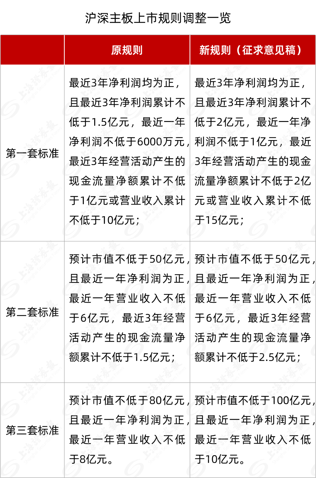 为进一步促进多层次资本市场协调发展,沪深交易所对包括主板在内的各板块定位和上市标准指标的进一步优化调整。 同时,沪深交易所还对照主板上市条件的修改,提高了主板重组上市条件。 有关业内专家表示,本次主板上市标准调整幅度较大,尤其是第一套指标接近翻倍,调整后的主板上市标准更能突显主板大盘蓝筹的底色,在规模、盈利能力等方面也更符合市场认知,有利于增强主板进一步聚焦服务大盘蓝筹企业,主板企业将具备更高的质量,能够更好地回馈投资者,也有利于更好地服务经济高质量发展。 科创板方面,上交所将同步修订《科创板企业发行上市申报及推荐暂行规定》,进一步完善科创板定位把握标准,支持和鼓励“硬科技”企业在科创板发行上市。 创业板方面,深交所修改创业板上市条件,突出抗风险能力和成长性。一是适度提高创业板第一套上市标准的净利润指标,将最近两年净利润指标由5000万元提高至1亿元,并新增最近一年净利润不低于6000万元的要求。二是适度提高创业板第二套上市标准的预计市值、收入等指标,将预计市值由10亿元提高至15亿元,最近一年营业收入由1亿元提高至4亿元,支持规模、行业及发展阶段适应创业板定位要求的企业上市。深交所也正在修订 《创业板企业发行上市申报及推荐暂行规定》,进一步完善创业板定位把握标准,支持有发展潜力的成长型创新创业企业在创业板发行上市。 在上市条件调整的过渡期安排方面,修订后的主板和创业板上市条件,拟自规则发布之日起实施。 日前,国务院印发《关于加强监管防范风险推动资本市场高质量发展的若干意见》(以下简称《意见》)。 《意见》要求,要严把发行上市准入关,提高主板、创业板上市标准,完善科创板科创属性评价标准,扩大现场检查覆盖面,强化发行上市全链条责任,加大发行承销监管力度,严查欺诈发行等违法违规问题。要严格上市公司持续监管,构建资本市场防假打假综合惩防体系,严厉打击各类违规减持,强化上市公司现金分红监管,推动上市公司提升投资价值。要加大退市监管力度,进一步严格强制退市标准,畅通多元退市渠道,精准打击各类违规“保壳”行为,健全退市过程中的投资者赔偿救济机制。 要加强证券基金机构监管,强化股东、业务准入管理,积极培育良好的行业文化和投资文化,完善行业薪酬管理制度,坚决纠治不良风气,推动行业回归本源、做优做强。要加强对高频量化等交易监管,严肃查处操纵市场恶意做空等违法违规行为,加强战略性力量储备和稳定机制建设,将重大经济或非经济政策对资本市场的影响纳入宏观政策取向一致性评估,增强资本市场内在稳定性。 |
