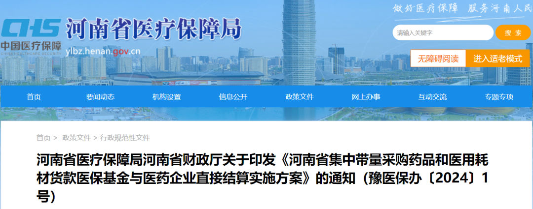 4月12日,河南省医保局发布通知,河南省医疗保障局河南省财政厅关于印发《河南省集中带量采购药品和医用耗材货款医保基金与医药企业直接结算实施方案》的通知(豫医保办〔2024〕1号)
