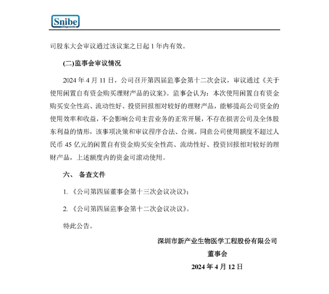 新产业4月11日公告,为进一步提高公司自有资金使用效率,增加公司现金资产收益,并确保资金安全、操作合法合规,在不影响公司正常生产经营的基础上,公司拟使用最高额度不超过45亿元的闲置自有资金购买安全性高、流动性好、投资回报相对较好的理财产品,以上资金额度在决议有效期内可以滚动使用。公司董事会同意授权公司总经理在额度范围内行使该项投资决策权并签署相关合同文件,决议有效期为公司股东大会审议通过该议案之日起1年内有效。