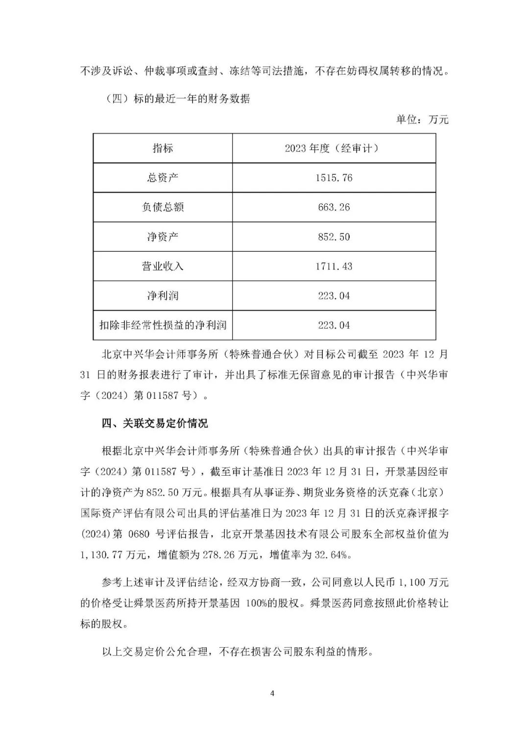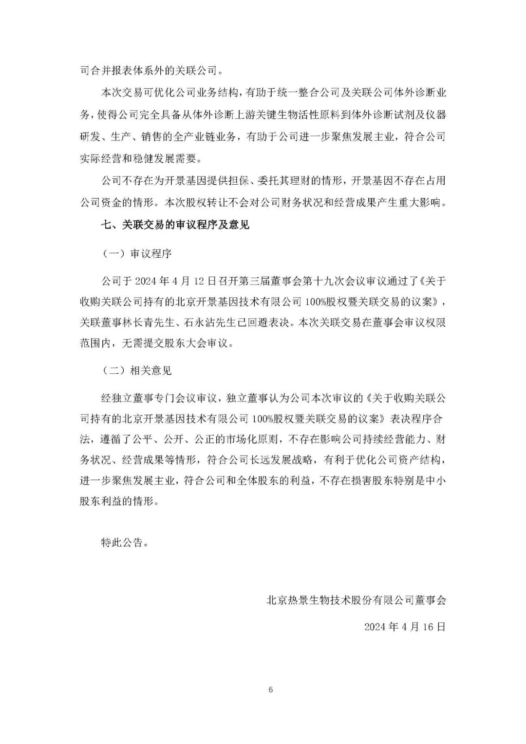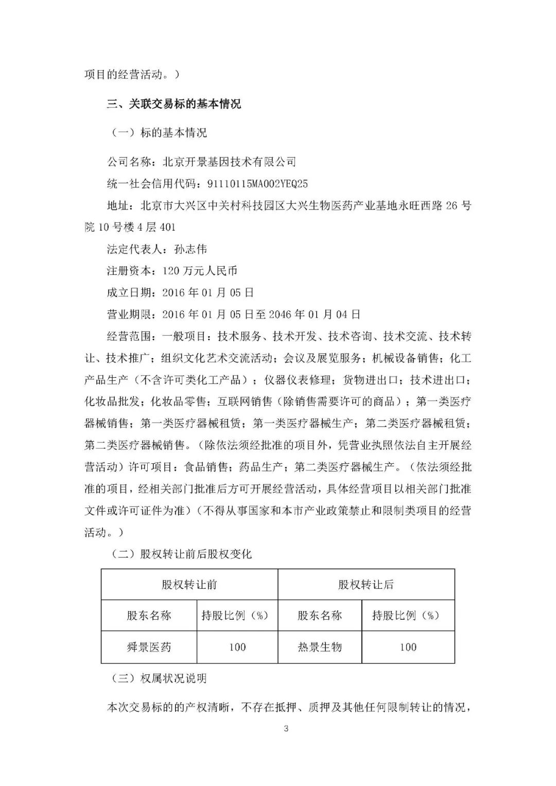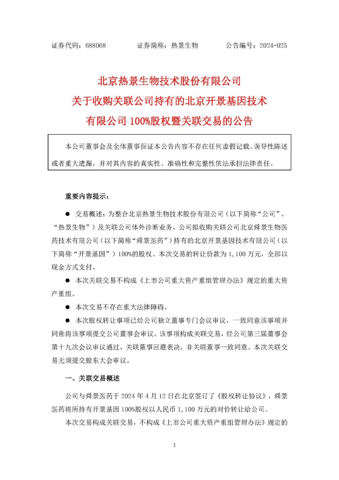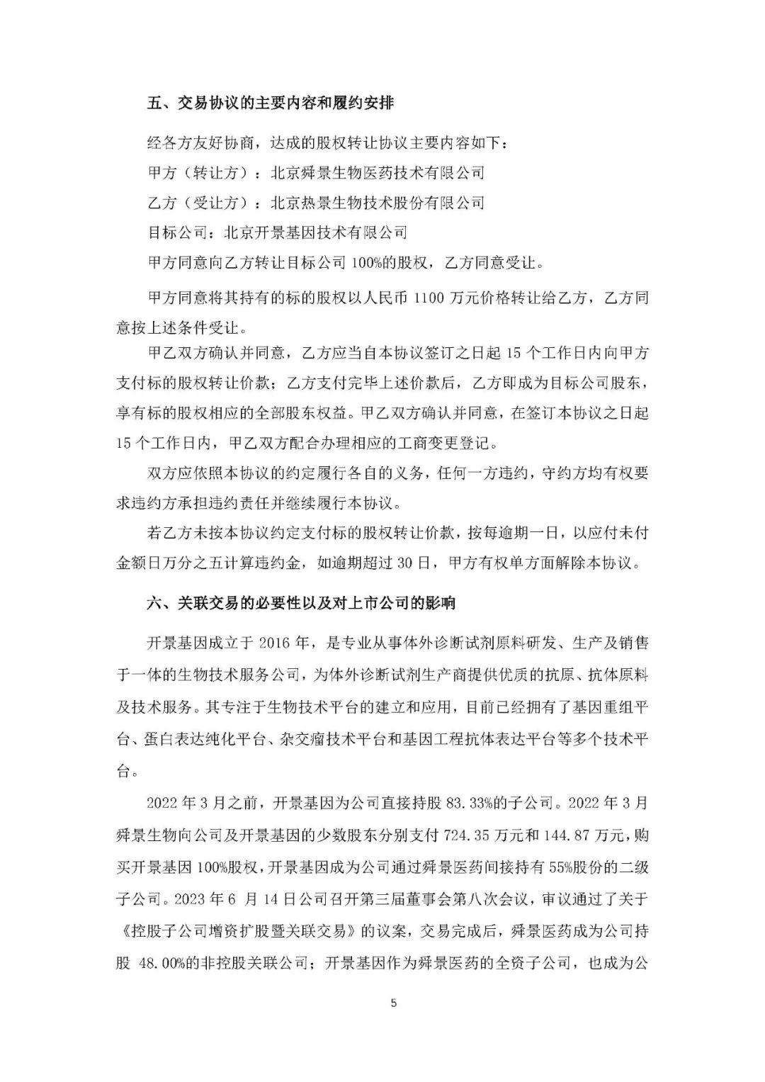 热景生物4月15日晚间发布公告称,公司与舜景医药于2024年4月12日在北京签订了《股权转让协议》,舜景医药将所持有开景基因100%股权以人民币1100万元的对价转让给公司。