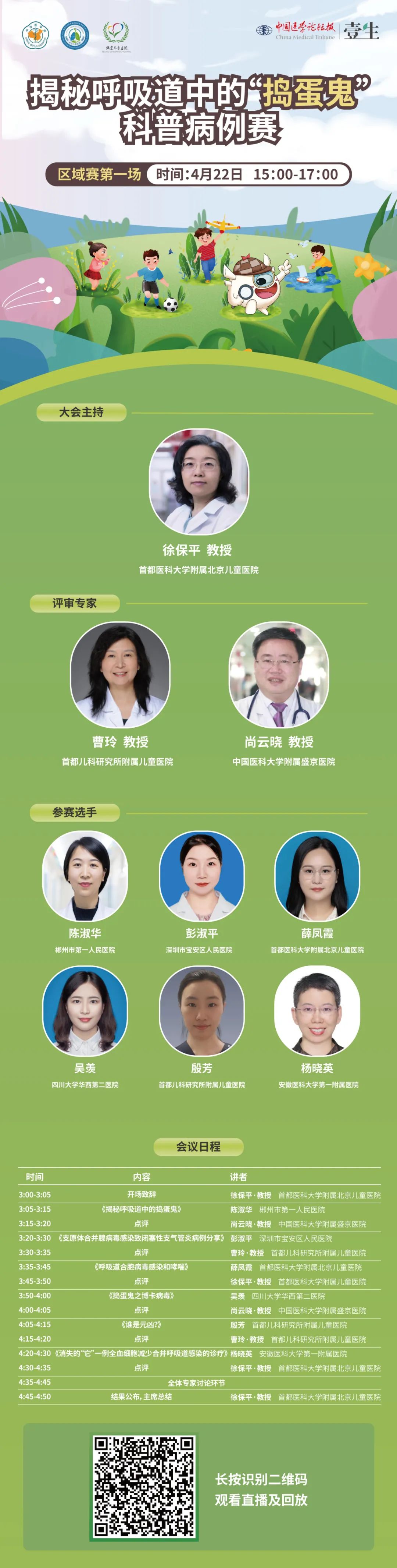 由中华医学会儿科学分会呼吸学组、国家呼吸系统疾病临床医学研究中心首都医科大学附属北京儿童医院联合主办,中国医学论坛报协办,海尔施基因公益支持的“揭秘呼吸道中的‘捣蛋鬼’科普病例赛”,自第一届举办以来,受到了广大医生同仁的好评。2024年4月22日,第二届“揭秘呼吸道中的‘捣蛋鬼’科普病例赛”重磅来袭!