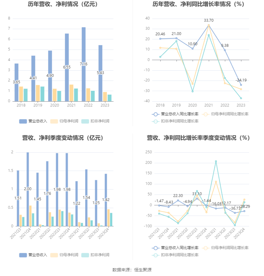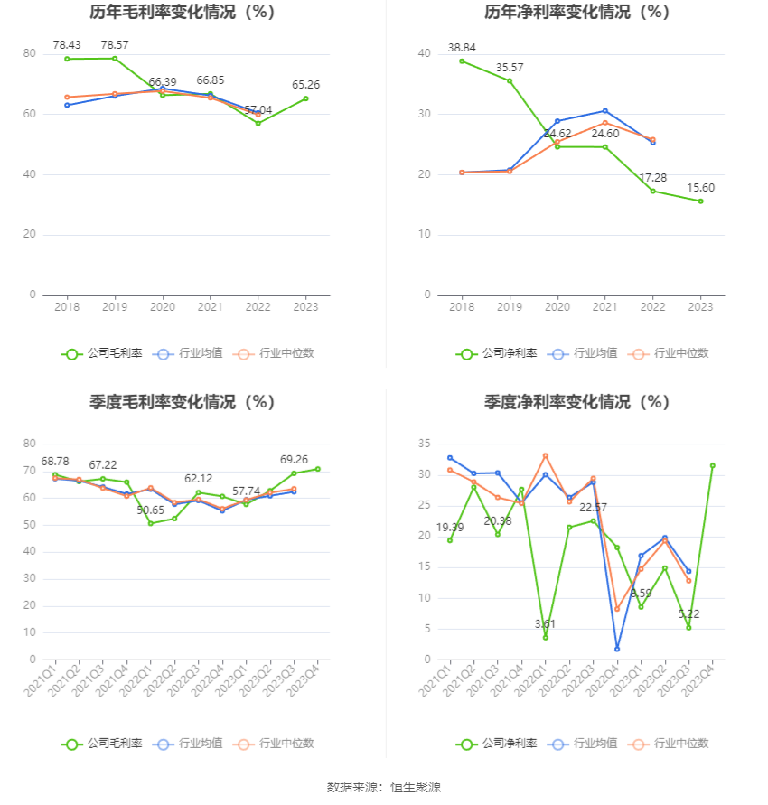 透景生命4月23日披露2023年年报。2023年,公司实现营业总收入5.43亿元,同比下降24.19%;归母净利润8940.35万元,同比下降28.34%;扣非净利润6370.40万元,同比下降37.11%;公司2023年年度利润分配预案为:拟向全体股东每10股派1.5元(含税)(约2462万元)。 数据统计显示,透景生命近三年营业总收入复合增长率为3.50%,在体外诊断行业已披露2023年数据的17家公司中排名第9。近三年净利润复合年增长率为-9.48%,排名11/17。 年报显示,公司主要从事自主品牌体外诊断产品的研发、生产与销售。 分产品来看,2023年公司主营业务中,体外诊断试剂收入5.00亿元,同比下降6.23%,占营业收入的92.19%;体外诊断仪器收入0.38亿元,同比下降78.75%,占营业收入的6.98%;服务收入收入0.04亿元,同比增长17.29%,占营业收入的0.81%。 截至2023年末,公司员工总数为574人,人均创收94.57万元,人均创利15.58万元,人均薪酬31.46万元,较上年同期分别变化-6.22%、-11.36%、39.86%。 2023年,公司毛利率为65.26%,同比上升8.22个百分点;净利率为15.60%,较上年同期下降1.68个百分点。从单季度指标来看,2023年第四季度公司毛利率为70.87%,同比上升10.16个百分点,环比上升1.61个百分点;净利率为31.56%,较上年同期上升13.31个百分点,较上一季度上升26.34个百分点。 分产品看,体外诊断试剂、体外诊断仪器、服务收入2023年毛利率分别为70.00%、3.02%、67.77%。 进一步统计发现,2023年公司自由现金流为3.05亿元,相比上年同期增长161.22%。 2023年,公司期间费用为2.80亿元,较上年同期减少1966.09万元;但期间费用率为51.63%,较上年同期上升9.74个百分点。其中,销售费用同比下降9.8%,管理费用同比下降15.5%,研发费用同比下降2.02%,财务费用由去年同期的-1123.54万元变为-446.14万元。 2023年全年,公司研发投入金额为7772.29万元,同比下降2.02%;研发投入占营业收入比例为14.32%,相比上年同期上升3.24个百分点。此外,公司全年研发投入资本化率为0。 |