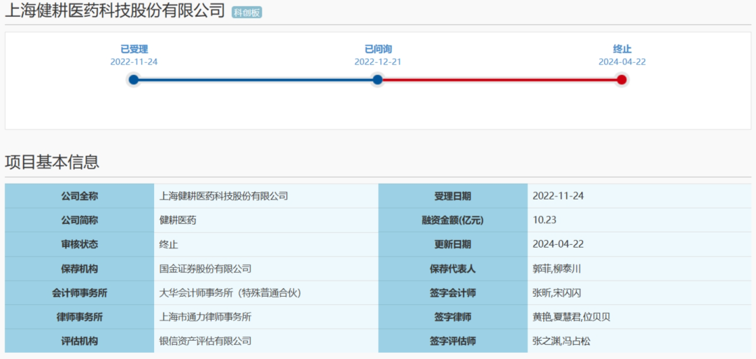 2024年4月22日,上海证券交易所官网显示,上海健耕医药科技股份有限公司科创板上市申请终止。