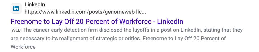 Freenome在linkedin上“”偷偷摸摸“”的宣布了一项裁员计划: