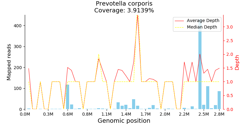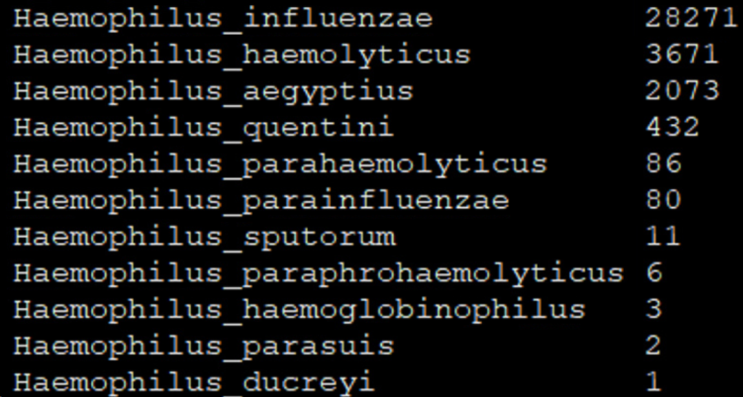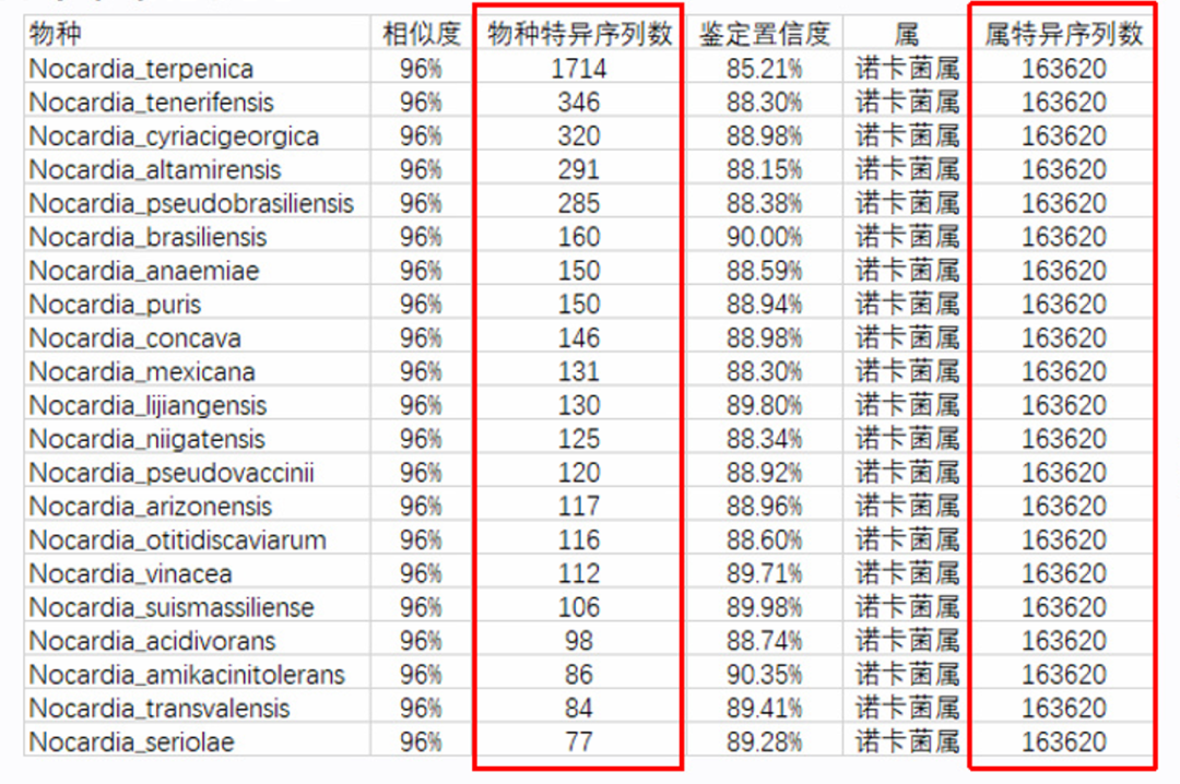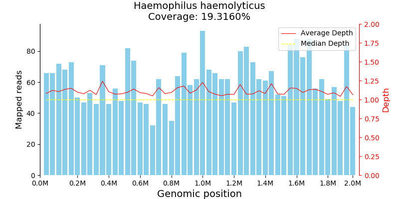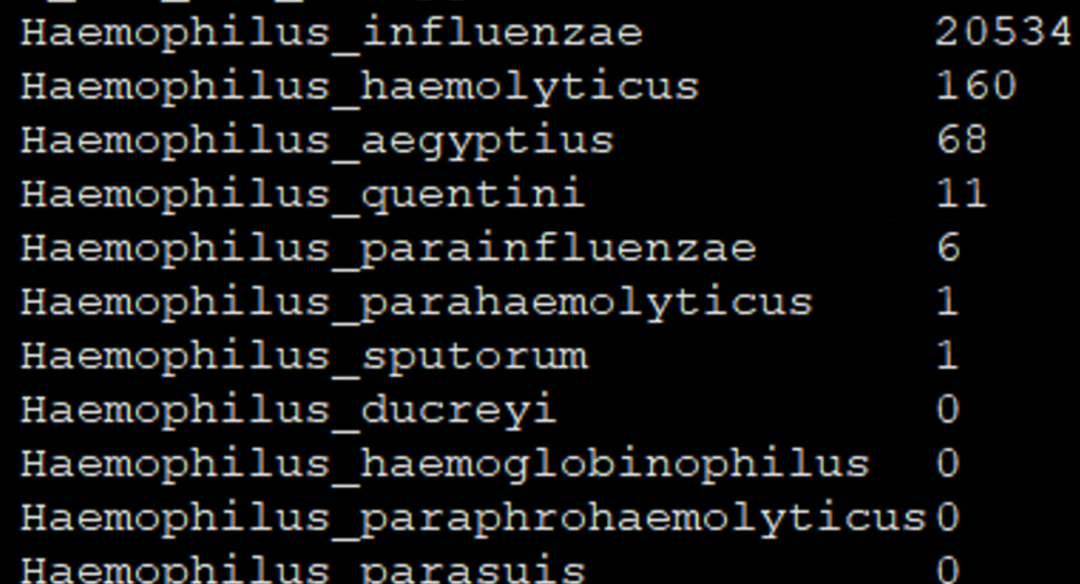 输出结果第二列flag值为4,即无比对结果,在比对软件层面这条序列直接无法比对上参考序列。这是因为两条序列在第18位有个错配,当最小种子长度是31的时候,查询序列生成的所有长度为31的种子里都会至少含有1个错配,而在比对过程中种子是精确匹配的,因此在种子匹配环节这条序列就比对不上了。 所以,如果用Kraken软件,且默认k-mer长度是31,那么这条序列就会无比对结果。 可以看出,同样的两条序列,即使同一个软件,不同的比对参数设置就得到了不同的比对结果,甚至直接决定着一条序列是否能比对上。所以在实际应用场景中需要不断调整比对参数进行测试,根据最理想的结果,找出最优的比对参数。 这种比对参数的不同在实际应用中会带来多大的影响呢?以呼吸道常见的病原体流感嗜血杆菌为例。 使用BWA MEM的默认参数(以ANI大于95%为物种分类阈值):比对上序列数是31,415。 优化比对参数后:比对上的序列数是34,775,提升了约10%。 仅仅是比对参数的调整就带来10%的信号值提升,但更重要的是,这10%的序列在默认参数的时候比对不上流感嗜血杆菌,但它们会可能错误比对上其它物种去,导至出现假阳性的结果。 比对参数之后,分类算法对分类结果的影响更大,特别是高度同源的物种。 序列是唯一比对时,可以直接分类到比对上的物种,序列多比对时(同源物种经常出现的问题)就需要用LCA进行分类。但是对于一些同源性高的物种,如果使用统一固定的ANI作为阈值,那么就可能出现要么分类到种的序列特别低,导至灵敏度低;要么出来很多同源的假阳性物种,导至特异性低。针对这些问题,可以个性化调整ANI阈值,还可以采用序列与不同物种的ANI的差异进行判断,甚至采用更为复杂的机器学习方法,如贝叶斯估计。 还是以流感嗜血杆菌为例,由于它与属内的埃及嗜血杆菌、溶血嗜血杆菌、副流感嗜血杆菌等在基因组上具有较高的同源性,而这些同源物种通常是常见的呼吸道定植菌。因此,如果分类不准确,就可能导至错误的将这些定植菌识别为流感嗜血杆菌,从而产生假阳性结果。 如果直接使用比对软件出来的默认结果且不做LCA分类,结果如下: 除了流感嗜血杆菌这个真阳性以外,出现了多个属内的假阳性,序列数还不低。真阳性与最高序列数的假阳性的信噪比是:28271/3671≈7.70 做了LCA分类之后: 真阳性的序列数有所下降,但假阳性的序列数降低幅度更大,假阳性物种的数量也减少了。真阳性与最高序列数的假阳性的信噪比是:20534/160≈128.33,比原来提高约17倍! 做了LCA分类+分类算法优化后: 真阳性的序列数还是有所下降,假阳性的序列数也以更大的幅度下降,假阳性物种也降低到了2个,有个假阳序列数也只有2条。真阳性与最高序列数的假阳性的信噪比是:8526/24=335.25,比仅采用LCA算法再提高约3倍。 需要说明的是,不同的物种可能有不同的模式,另外也可能需要在信号值和信噪比之间做一些平衡,在物种检出序列数低的时候对灵敏度有一定的影响。 其他一些属,如链球菌属、葡萄球菌属等也存在属内不同的物种有些是定植,有些是致病菌,且同源性比较高的情况。特别是定植菌通常丰度还很高,分类算法对同源性物种区分不好时,极容易带出假阳性的致病菌。部分临床上重要的同源性高的物种如下,红色字体的是临床比较常检出或容易鉴定错误的。 从上面的例子中也可以看出,尽管基因组数据库、比对算法、分类算法都做了深度优化,但还是有一些假阳性结果,还有没有什么解决方案了呢? 一种可能的策略是对每个检出的物种引入“鉴定置信度”打分。 mNGS理论上是一种无偏倚测序方法,对于真阳性的病原体,其测到的序列落在基因组上任意位置的概率符合泊松分布,在不考虑GC含量等差异的影响下,也就是基因组任意相同长度的区间检出的序列数是相近的。直观上的感觉就是检出来的序列在基因组上图画出来的分布图是“均匀的”。例如长这样: 图24. 真阳性物种检出序列在基因组上的分布。基因组分为50个区域,每个区域比对上的序列数无显著差异。 而假阳性的物种是有一定特征的,要么是片段污染,要么同源鉴定错误等。污染的片段、同源的区域都是一些比较小的片段,所以假阳性的序列基本都是出现在这些位置上,是不符合泊松分布的。那么画出来的基因组分布图是很“不均匀的”,例如长这样: 图25. 假阳性物种检出序列在基因组上的分布。基因组分为50个区域,每个区域比对上的序列数差异显著。 这种分布的随机性可以用“离散度”来衡量,但是仅仅这个离散度还是不够的,特别是做RNA检测时,本身基因的表达是有差异的,在测到的序列在基因组上不同的基因区域出现的概率不相等,所以还需要引入其它指标,例如检出序列数、ANI、其它物种的检出、同源物种的先验信息、测序深度、宿主率等等指标,进行不同权重的打分建模,训练出性能可用的模型来判断。这也是一个大工程,没有统一标准,不同人有不同思路和经验,不展开讨论。 以新冠病毒为例,如果数据库没有新冠病毒的序列(比如刚发现新冠时),就会检出来SARS-CoV的假阳,如下图,检出序列数较少,序列在基因组上分布不均匀,ANI仅有94.5%,最终算出来的置信度只有59.68%(90%以上为可信)。 图26. 新冠病毒导至的SARS-CoV假阳性检出。只有部分同源性高的区域有序列检出,每个区域检出的序列数差异显著,最终算出的置信度也