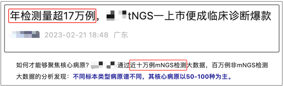 感染tNGS系列业务收入较2022年增长398.97%,即近4倍。2022年tNGS销售情况如何呢?官微有披露年销量数据:17万例。 假定2023年tNGS产品单价较2022年不变,则2023年全年销量可为 17*(1+4) = 85 万例;2023年,市场高度竞争导至的单价下降应是大概率趋势。如平均单价X下降幅度20%,则该企业全年销量数据则可来到(17*X*5)/(0.8*X) = 106 万例;单价下降30%,则该销量数据达到 121 万例;(ps:笔者另外检索了全国近两年该项目的招标情况,比较零散,并不能从统计上直观看到价格变化的幅度。大家可以从一线市场中感知、估计普遍下降幅度。)tNGS在2023年迎来普遍升级,产品升级可能会带来产品价格的上升。从营收增长反推销量总量数据情况,则取决于新品在售出产品中的占比。但从一般情况看,新品需要市场孵育周期,且高价产品销量往往跑不过低价流量产品。关联公司曾在3月,曾披露一组数据,单月tNGS突破5w例。 假定月均 5w 例维持不变,全年销量则为 60w 例;但考虑产品在当时正处于放量和高速增长阶段,实际年检测量应远高于这一数值。2023年为呼吸道感染大年,医院尤其儿科人满为患,圣湘等分子诊断企业在年末都迎来业务井喷,美团、京东居家送检也开始普及;整体环境应有利于tNGS产品放量;医疗反腐,对于入院合规的ICL厂家,影响应有限,其他以走廊收费的样本反而会流入合规渠道。从以上公开信息可估计,该企业tNGS年检百万左右,具备现实可能性。 (1)市场上,开展mNGS/tNGS的企业有哪些?- 大型ICL连锁:金域、迪安、艾迪康、华银、云康、康圣环球