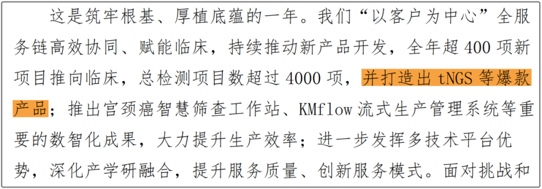 本篇属于填坑系列,自己挖的坑得自己来填。 最直接的方法,问在该企业的朋友,你会得到直接干脆的回复:曲线救国,我们只能从可搜集到的公开材料中寻找蛛丝马迹,作有限推断:未披露具体销售数据,但在董事长致辞中专门提及“打造出tNGS等爆款产品”,可见重视程度;