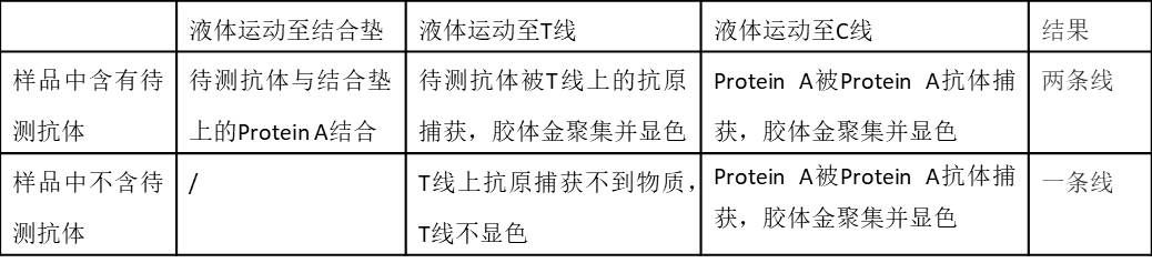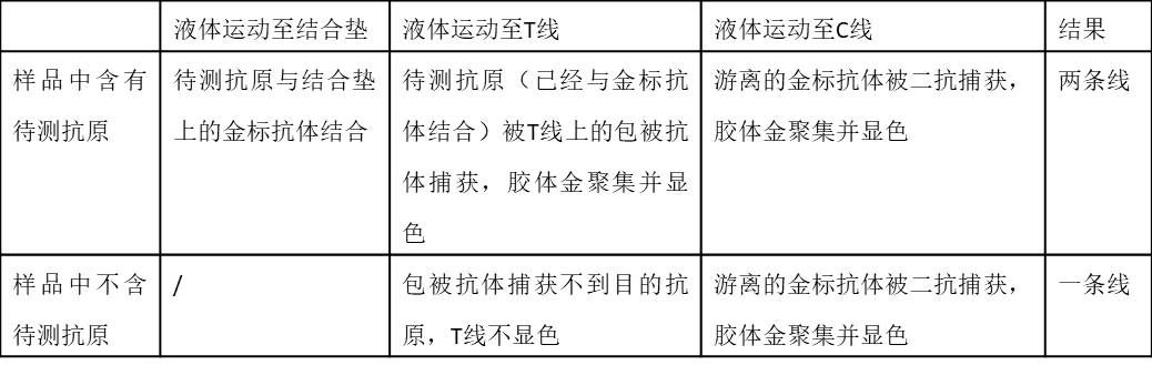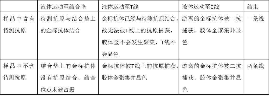 当待测样品液体滴加到试剂条上后,通过层析作用,液体依次会运动至结合垫、T线、C线,每个阶段的反应如下表所示: