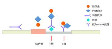 间接法主要用于检测抗体。如果胶体金检测平台使用的是间接法,则试剂条的结合垫上固定的是带有胶体金标记的Protein AProtein A能够与抗体非特异性结合),NC膜上的T线固定的是能与待测抗体特异性结合的抗原,NC膜上的C线固定的是抗Protein A抗体。