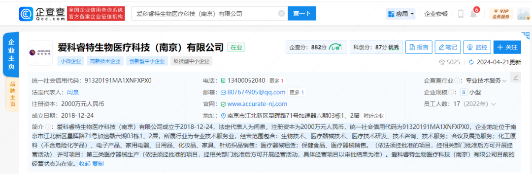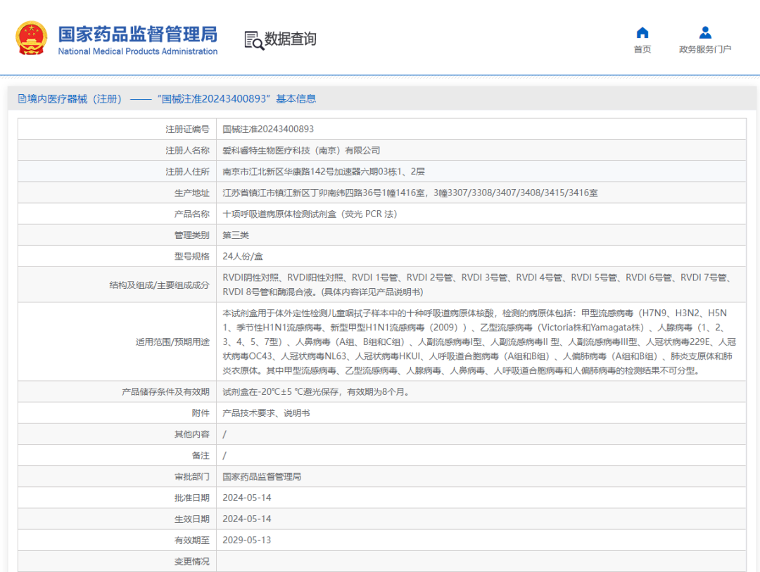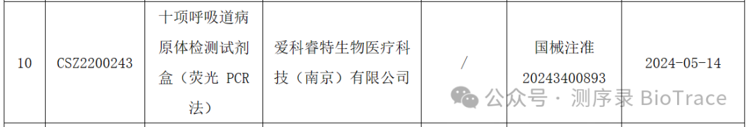 5月14日,爱科睿特生物医疗科技(南京)有限公司十项呼吸道病原体检测试剂盒(荧光 PCR 法)正式获得国家药品监督管理局颁发的医疗器械注册证 (国械注准:20243400893)。