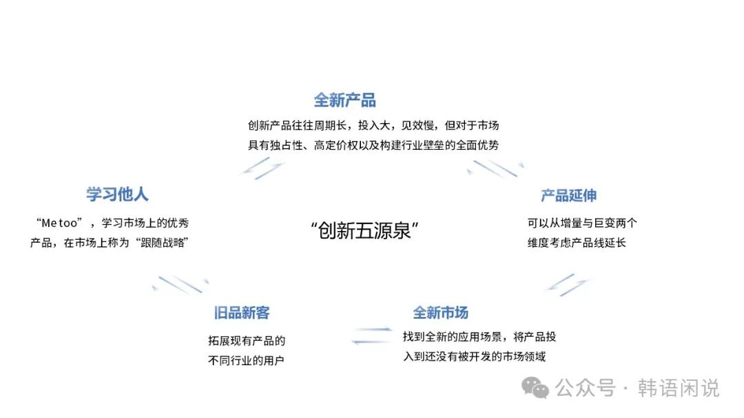 首先我们需要明确一个概念,就是产品创新不完全是“发明创造”,更多的产业创新是“整合优化”。通常情况下,除去完全创新的产品,主要还有四个方向思考创新来源,笔者称之为“创新五源泉”