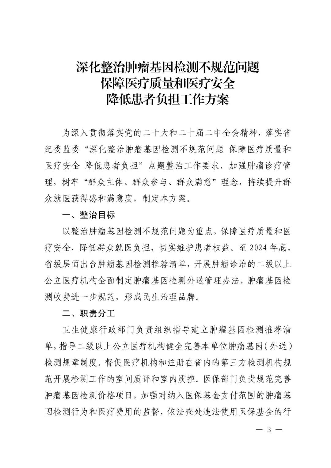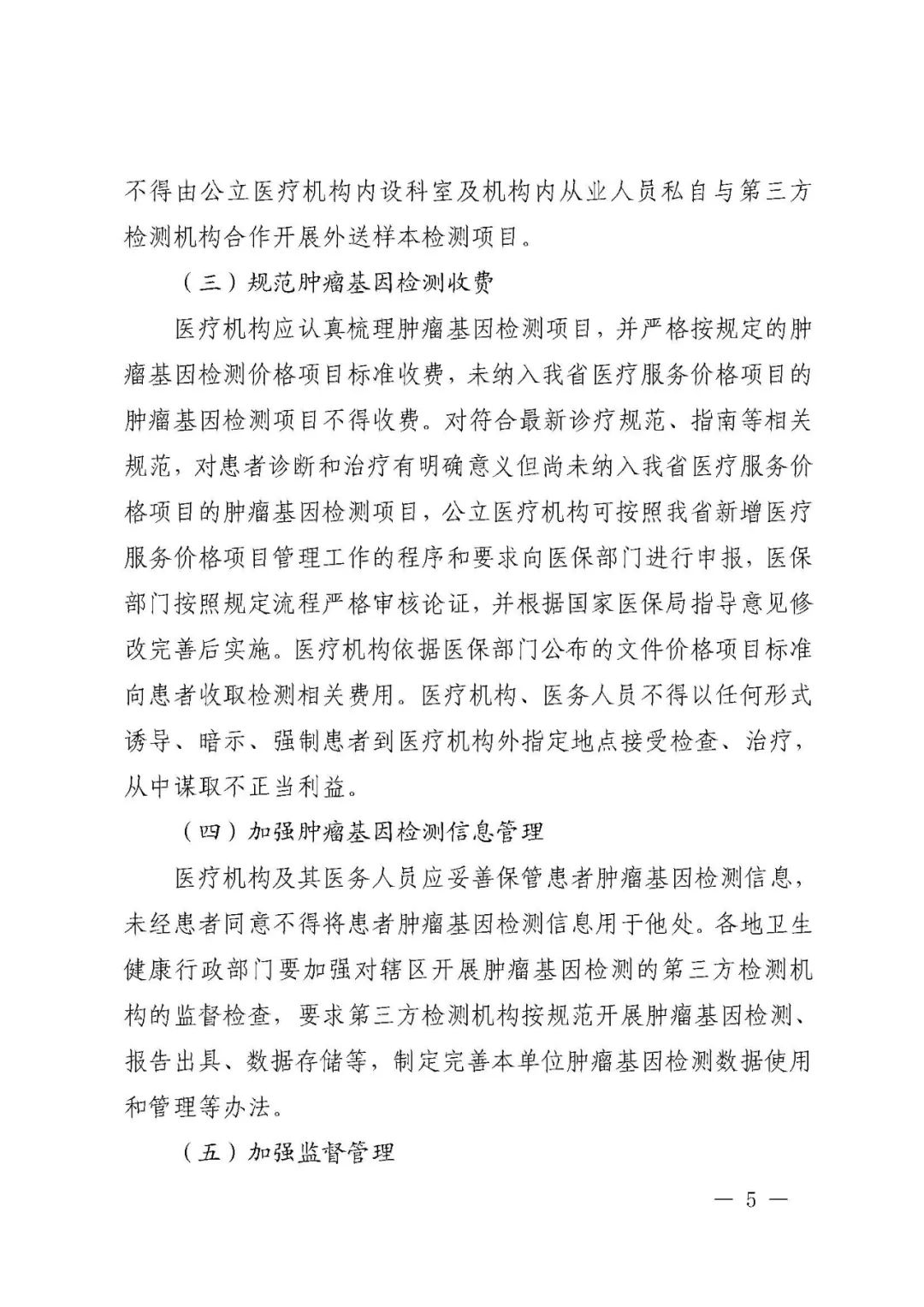 方案重点内容: 1、至2024年底,省级层面出台肿瘤基因检测推荐清单,开展肿瘤诊治的二级以上公立医疗机构全面制定肿瘤基因检测外送管理办法,肿瘤基因检测收费进一步规范,形成民生治理品牌。 2、基因检测项目必须是最新诊疗规范、指南和专家共识中明确提及、高度认可、对患者诊断和后续治疗有明确意义的检测项目。 3、对于本单位无法开展的基因检测项目,医疗机构应制定工作方案,建立外送检测项目目录,并根据临床实际需求,定期调整。鼓励通过建立医联体、肿瘤诊疗协作组、委托第三方等方式实施。不得由公立医疗机构内设科室及机构内从业人员私自与第三方检测机构合作开展外送样本检测项目。 4、医疗机构应认真梳理肿瘤基因检测项目,并严格按规定的肿瘤基因检测价格项目标准收费,未纳入福建省医疗服务价格项目的肿瘤基因检测项目不得收费。 5、重点对医疗机构基因检测收费是否合理、是否存在过度检测以及是否存在医生与检测机构勾连“回扣”等问题开展监督检查,并将检查情况纳入廉洁从业行动计划工作报送。 |