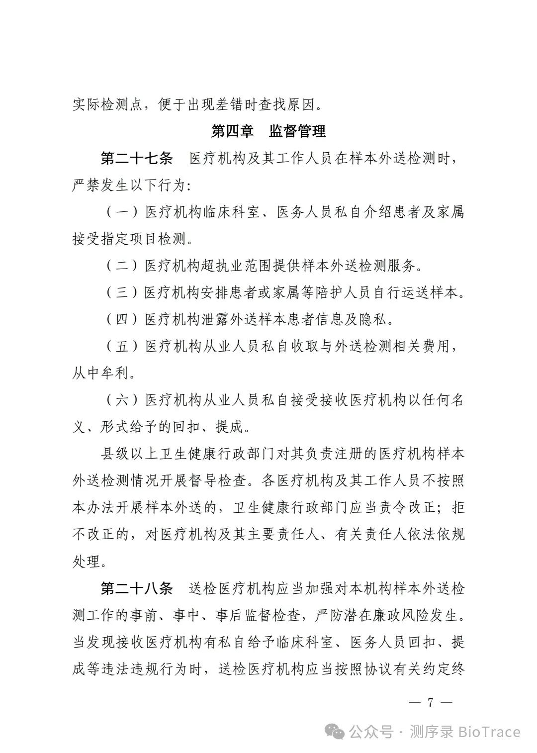 近日,山东省出台《山东省医疗机构样本外送检测管理规范》,对临床样本外送进行了更加详细的约束。 (1)鼓励医联体内部开展样本外送检测服务,城市医疗集团或县域医共体的牵头医院应当具备向成员单位提供医学检验、病理诊断等服务能力,为区域内提供同质化、标准化服务。 (2)送检医疗机构确定开展基因检测时,应当充分遵循询证医学证据,选择最新诊疗规范、指南和专家共识等中明确提及、高度认可、对患者诊断和后续治疗有明确意义的检测项目。对于无明确指征、花费较高的检测项目要严格把控,避免过多诊疗。 (3)送检医疗机构应当根据诊疗需求向接收医疗机构提出检测申请,接收医疗机构在完成检测后应当及时提供检测报告。接收医疗机构不得在送检医疗机构内直接面向患者开展服务。 (4)送检医疗机构临时需要增加协议范围外的外送检测项目时,由临床科室填写《医疗机构样本外送检测协议外新增项目审批表》,与检验/病理有关部门协商一致,报业务主管职能部门,经分管院领导审批同意后方可外送检测。 (5)送检医疗机构应当加强对本机构样本外送检测工作的事前、事中、事后监督检查,严防潜在廉政风险发生。当发现接收医疗机构有私自给予临床科室、医务人员回扣、提成等违法违规行为时,送检医疗机构应当按照协议有关约定终止合作。 附件:原文