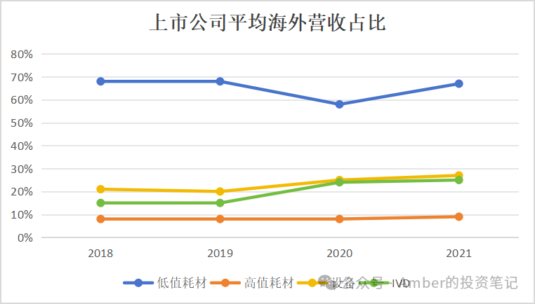 通过筛选医疗器械板块中高值耗材、低值耗材和医疗设备企业海外业务收入占比,可以总结出不同细分赛道的特点。2022年低值耗材海外业务收入占比平均为55.4%,医疗设备达到 38.8%,高值耗材则为 14.1%,该数据的高低基本说明了不同赛道出海的难易程度,最容易且最早出海的是低值耗材,其次是IVD及医疗设备,而高值耗材目前整体仍处于出海的起步阶段。