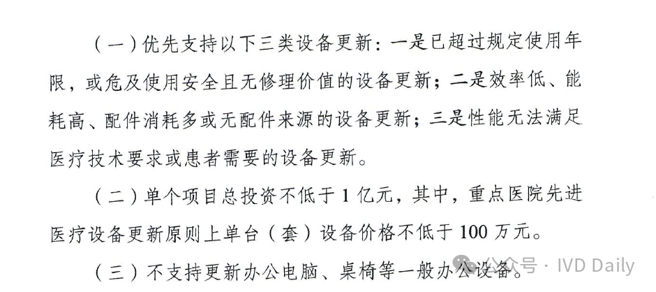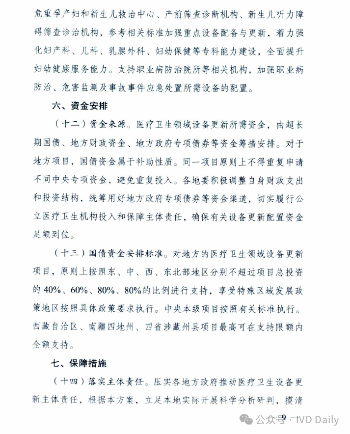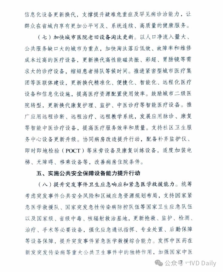 近日,国家发改委、国家卫健委、国家中医药管理局、国家疾控局四部委联合印发《关于推动医疗卫生领域设备更新实施方案的通知》。 通知明确到2027 年,医疗卫生领域设备投资规模较2023年增长25%以上,高端医疗设备短板加快补齐,县域基层医疗设备条件持续改善,有力支撑基层医疗服务能力提升和分级诊疗制度建设,应对重大公共卫生安全风险的医疗设备保障和应急能力明显提升。 鼓励拔尖医院重大医疗设备配置升级 适度超前配置,推动产学研转化! 聚焦肿瘤、心脑血管病、代谢性疾病等严重危害人民群众健康的重大疾病,鼓励国家医学中心等一批国内拔尖医院对标国际一流水平,适度超前配置一批高端放疗设备、超高场强磁共振成像系统、手术机器人、高分辨质谱仪、超高分辨率显微成像及分析系统等融合型、交叉型重大医疗和科研设备,提升医院疑难危重症诊疗、关键医学技术攻关能力,推动我国临床医学和科研转化走在世界前列。 推进乡村医疗卫生机构设备标准化 基层医疗规范标准! 以中西部为重点,参考《乡镇卫生院医用装备配置标准》等要求,填平补齐、对标达标,支持服务人口多、基本医疗服务能力强的乡镇卫生院,配置x射线计算机断层扫描系统(ci)、数字射线成像检测(DR)、彩超、全自动生化分析仪等设备,以及呼吸机、肺功能仪等满足基本医疗服务需求的通用和专用设备,加快提升常见病、多发病诊疗以及预防保健、康复护理、健康管理、医养结合、中医药健康服务能力,提高设施设备适老化水平。乡镇卫生院中医科设备配置参考《中医综合服务区(中医馆)建设指南》。加强乡村医疗卫生人员配备与培训,提升设备运行维护能力,坚决杜绝闲置浪费。 支持县级医院医疗设备提质 五大中心建设再提速! 参考《县级综合医院设备配置标准》《县级中医医院医疗服务能力基本标准和推荐标准(试行)》等要求,综合当地服务人口以及服务范围内群众卒中、胸痛、创伤、危重孕产妇救治、危重儿童和新生儿救治等医疗服务需求等因素,根据承担功能定位,支持县级医院科学合理配置除颤仪、呼吸机、血液透析、便携式彩超、转运监护仪、新生儿监护、床旁血气分析仪等设备,支持配备中医电、磁、热等特色诊疗设备,提升肿瘤、心脑血管疾病等重大疾病诊疗能力,加强急诊、重症、中医、老年医学、康复、安宁疗护等专科能力建设,支撑县级医院更好发挥县域龙头作用。 加强县乡村医疗服务协同联动 推进县域医共体建设;基层结果互认! 推进紧密型县域医共体建设,提升医学检验、医学影像、心电诊断、病理诊断、消毒供应等资源共享中心设备配置水平,统筹县域肿瘤防治、慢病管理等临床服务相关设备配置,提高资源配置和使用效率。推动基层医疗卫生机构设备数字化替代,支持模拟设备加快向数字化设备转型升级,支持配置临床诊疗实用型、小型化、集成化、可移动医疗设备,探索配备装配DR、快速检验等设备的智能化巡回医疗车等。支持共享中药房设备配备,提高智慧化中医药服务能力。提高人工智能辅助诊断技术在县域医共体内应用能力,促进远程医疗延伸到乡村,推动基层检查、上级诊断、结果互认,助力实现“一般病在市县解决,日常疾病在基层解决”目标。 实施城市医疗设备更新升级和数字化转型行动 支持省域医学高地设备更新扩容和数字化转型 围绕实现大病不出省目标,支持国家区域医疗中心、省级高水平医院、中医特色重点医院等,配置磁共振成像系统(MR). x 射线计算机断层扫描系统(CT)、数字减影血管造影检查(DSA )等医学影像设备,医用直线加速器、手术机器人等治疗设备,体外膜肺氧合机(ECMO)、呼吸机、远程监护等生命支持设备。推动数据驱动型信息化建设模式,推进医疗设备智能化改造升级,升级计算、存储、安全等基础设备,提高医疗数据资源的高效汇集、安全使用、合规分析能力。加强远程医疗和信息化设备配置,强化中医类医院相关信息化设备更新换代,支撑提升疑难危重症及罕见病诊治能力,让群众在省域内享有更加公平可及、系统连续、高质量的健康服务。 加快城市医院老旧设备淘汰更新 提质扩围,设备更新换代! 以人口净流入量大、公共服务缺口大的城市为重点,加快淘汰落后低效、故障率和维修成本过高的医疗设备,更新换代高性能磁共振、彩超、胃肠镜等需求大的诊疗设备,缩短患者排队等候时间。推进紧密型城市医疗集团等医联体建设,更新换代精准化、便捷化、智能化、远程化医疗设备和信息化设施,提高医疗资源配置使用效率。鼓励城市二级医院转型,更新换代康复护理、监护、中医诊疗等智能医疗设备。推广应用远程诊断、远程治疗、远程教学系统,发展应用脉诊、康复等智能中医诊疗设备,提高医疗服务效率和质量。支持社区卫生服务中心设备更新升级。协同病房改造提升行动,配备补齐监护仪、即时即地检验(POCT )等床旁设备及康复训练设备,适度加装电梯、无障碍、移乘设备等,改善病房住院条件。