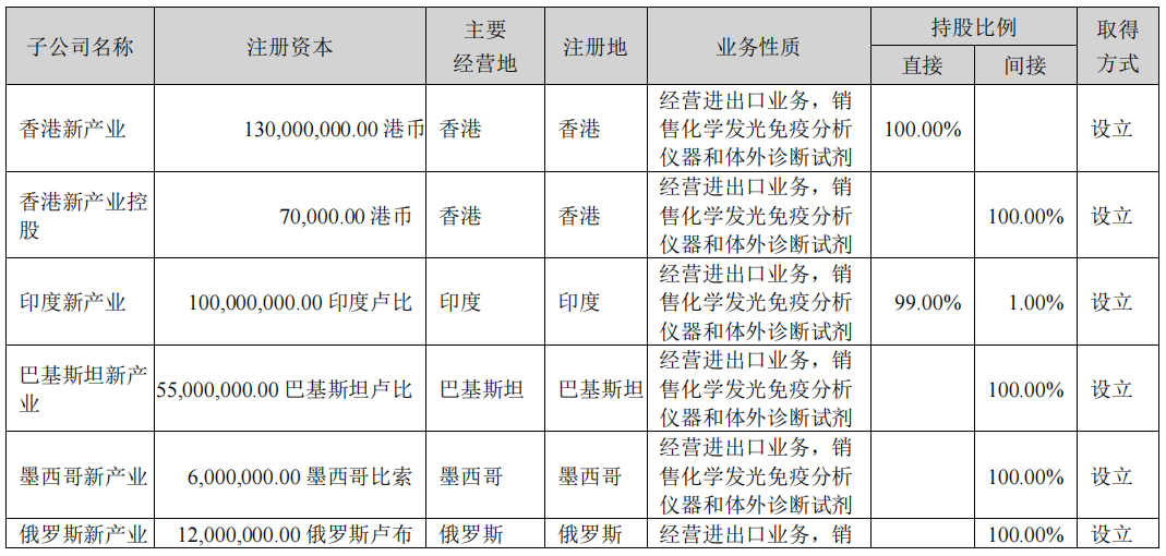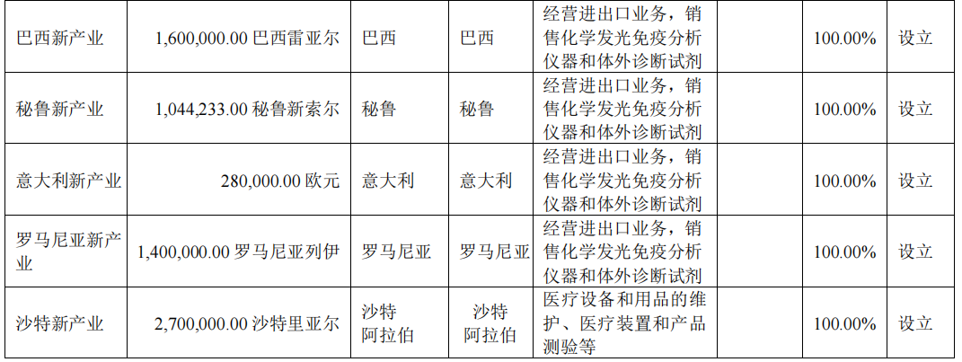 公司于 2010 年成功研发并推出了国产第一台全自动化学发光免疫分析仪。产品已销售至海外 152 个国家和地区。为推动海外市场的发展,公司将海外市场逐步细分,实施区域化管理模式,并深耕海外本地化经营,助力海外业务迈向新阶段,目前公司已完成 10 家海外子公司的设立。