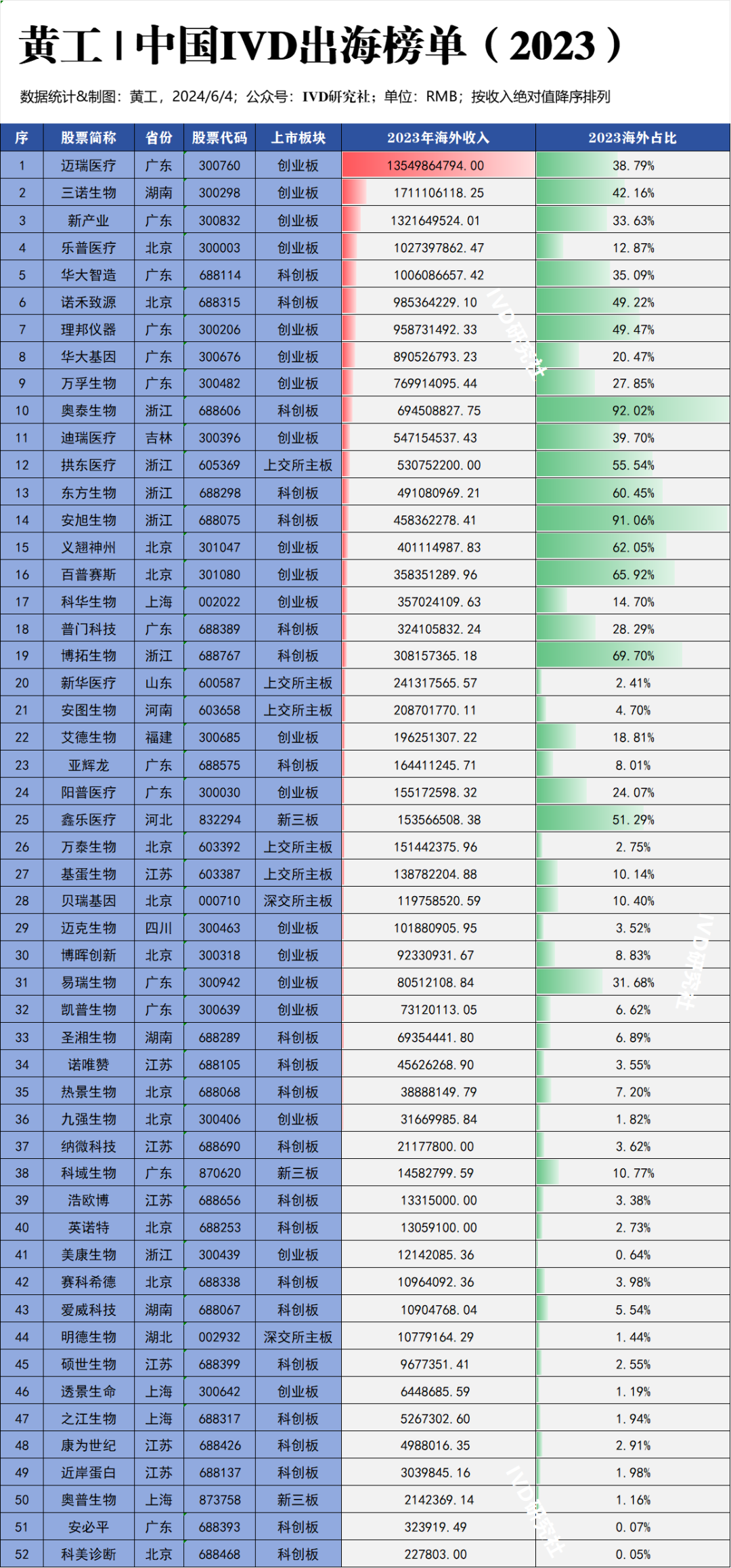 3. 榜单中52家IVD相关企业,海外收入中位数为145112290.42元,即1.45亿,有14家企业低于此数据;海外占比中位数为9.48%,约10%左右,有26家企业低于此数据。