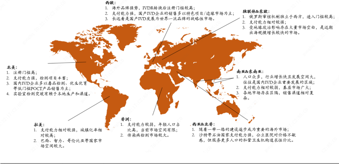 北美主要是美国,是全球最大医疗器械市场,占市场份额40%左右。2022年,美国GDP25.46万亿美元,人均GDP7.65万美元,总人口3.4亿,老龄化率17%,人均医疗支出13341美元,医疗支出占GDP比重约17%。美国的注册门槛是最高的,不过支付能力强,检测项目丰富。目前,国内IVD企业进入美国市场,主要以较低门槛的POCT产品为主。中国企业进入美国市场,主要有3条路:①收购或新设当地子公司;②与当地知名经销商ODM合作;③为当地企业OEM代工。