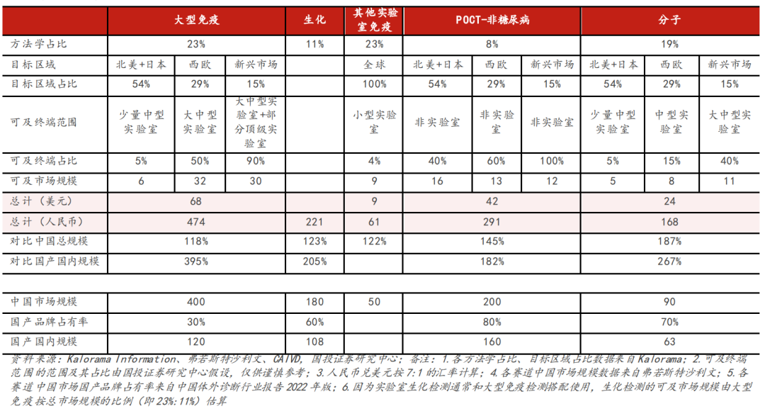 下表各细分市场规模测算数据,可以作为参考。海外市场,比如发达地区,北美、西欧、日本等,主要是免疫、分子和POCT的需求量较大。