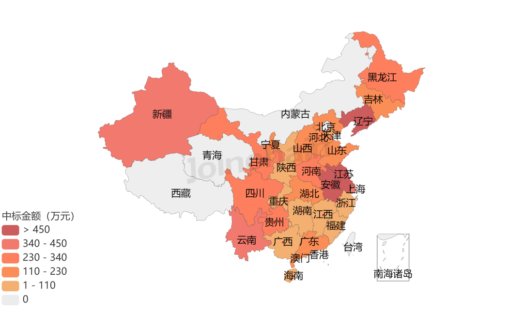 据MDCLOUD(医械数据云)统计,在2024年4月,共收集156条生化分析仪中标数据,涉及131家采购单位和22个品牌商。根据MDCLOUD(医械数据云)统计的已披露的品牌与金额数据结果,2024年4月中,迈瑞排名第一,金额占比为36.46%;日立高新排名第二,金额占比为21.86%;贝克曼排名第三,金额占比为17.99%。图表1 2024年4月生化分析仪品牌中标情况(Top10)从型号上观察,2024年4月份,贝克曼型号为AU5800的生化分析仪排名第一,其中标总额占比为9.41%;位居第二的是迈瑞的BS-830,中标总额占比为5.37%;日立高新排名第三,型号为日立LAB0SPECT008a,中标总额占比为4.94%。图表2 2024年4月生化分析仪品牌型号中标情况(Top10)根据中标结果,2024年4月生化分析仪招标较活跃的地区主要在江苏省,采购金额占比为12.04%,辽宁省排在第二,金额占比为8.13%,安徽省为第三位,金额占比为8.05%。图表3 2024年4月各省(自治区、直辖市)生化分析仪中标金额(单位:万元)