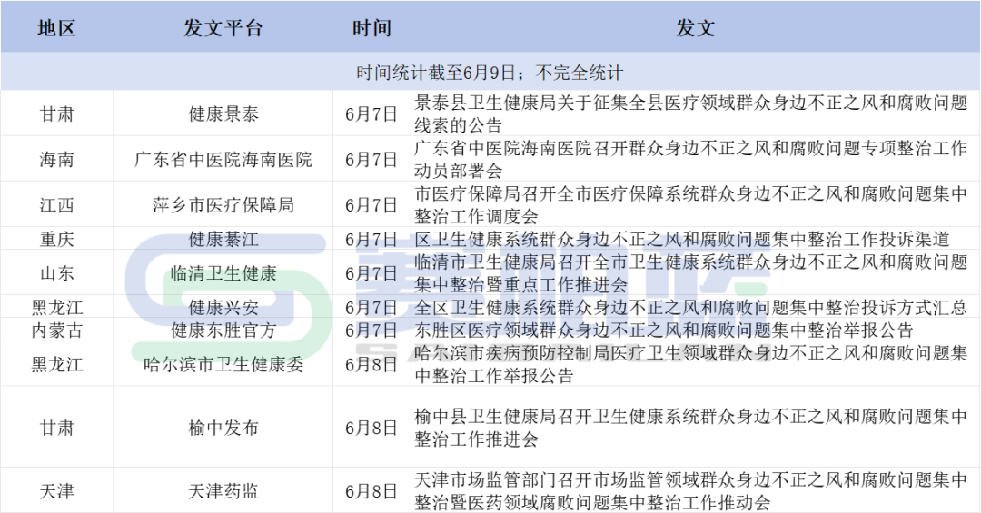 例如,甘肃甘南卫生健康在6月7日发布《关于在全州卫生健康系统深入推进集中整治群众身边不正之风和腐败问题专项整治工作的公告》,整治重点集中在医药领域腐败问题和不正之风;形式主义、官僚主义问题方面;常态化扫黑除恶方面问题,一直持续到2024年10月底。