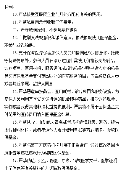 例如,第一项第8条指出,严禁接受医药企业等的礼金、礼品、购物卡、有价证券等贵重财物;