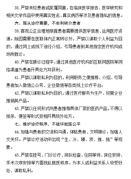 福建省的“九项准则”包括:合法按劳取酬,不接受商业提成;严守诚信原则,不参与欺诈骗保;依据规范行医,不实施过度诊疗;遵守工作规程,不违规接受捐赠;恪守保密准则,不泄露患者隐私;服从诊疗需要,不牟利转介患者;维护诊疗秩序,不破坏就医公平;共建和谐关系,不收受患方“红包”;恪守交往底线,不收受企业回扣。