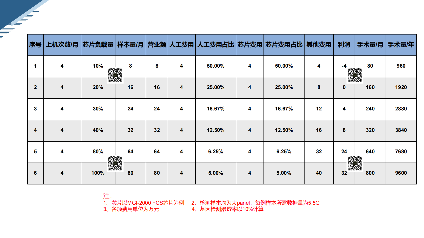 注:以每月上机四次为基准;芯片为MGI-2000 FCS芯片;检测样本均为大panel,每例样本所需数据量为5.5G(均为组织);院内价格每例为1w元;各项费用单位为万元;基因检测渗透率以10%计算
