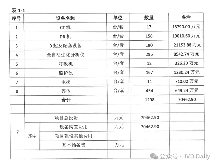 项目总投资7.05亿。其中购置CT、DR、彩超、全自动生化分析仪、血液分析仪、电解质分析仪、尿液分析仪其他等设备7.05亿。