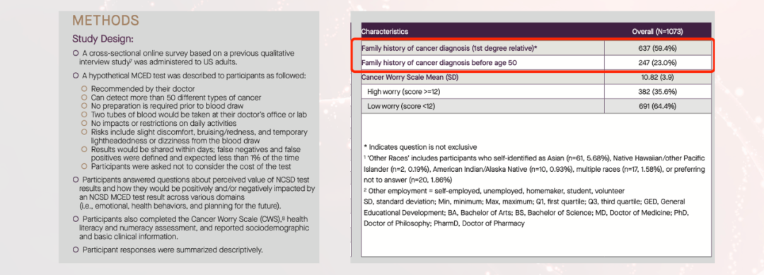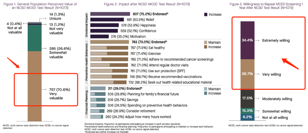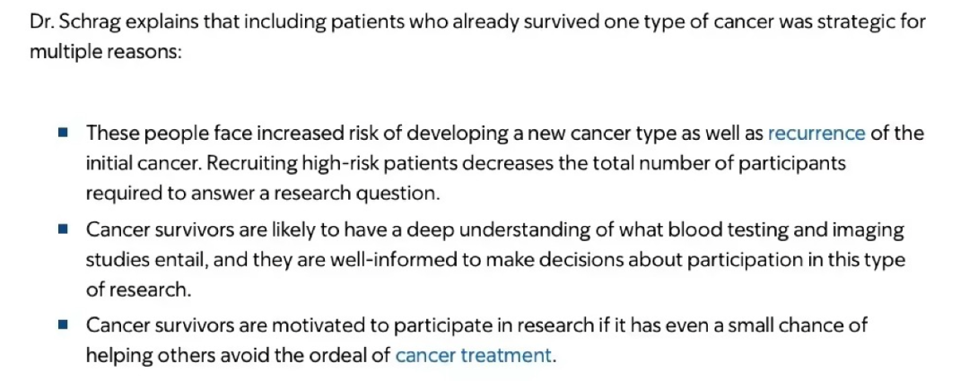 换句话说,如果FDA/CMS认为Galleri在一般人群是可用且有效的,那么在肿瘤幸存者人群中这个结论只会更为坚定。 发病率足够高、性能足够好,第一个问题解决了。 02 “人”愿做吗? 把这个问题翻译成更通俗易懂的语言,叫:依从性。 如果再拆分一下,是“首次依从性”和“长期依从性”两个维度。 1. 首次依从性 在PATHFINDER中,肿瘤幸存者的比例超过24%(1609/6578)。 而2019年的数据显示肿瘤幸存者在美国人口中的比例仅有大约5%(1690万/3.28亿)。 在无差别入组的情况下,为什么比例会有这么悬殊的差距? 这个问题也许可以从对Dr.Schrag(PATHFINDER的PI)的采访中找到答案。 “更高的发病率——恐惧,更理解筛查——认知,还有善良” 前两者都可以在真实世界中转化成更高的首次筛查意愿。 2. 长期依从性 考虑到肿瘤发病率的绝对值并不高,因此: 即使是高发病率的肿瘤幸存者人群,在一次肿瘤早筛中拿到阴性结果依然是大概率事件。 “阴性报告”这件事情,他们能感知多大的价值,决定了他们是否会有长期的依从性 ——简而言之,愿意第二年再筛一次。 我们确实没找到这个人群直接的依从性证据。但是我们有一个间接的——同样“高风险”的人群。 在这次ASCO上,Grail还有个poster也很好玩,在一个大比例(59.4%)有一级亲属患癌的人群中,调研了一个问题: 假如拿到一个阴性结果,你们觉得有价值吗? 70.6%的人觉得很有价值,非常/极度愿意第二年复测的人是61.1%。 如果大家还记得Grail在资本市场日被挑战的10%复购率,就会发现这个数字有多sexy。 当然,这里面也不是那么严谨,因为调研里面没有谈钱的事情。 不过,总体来看,肿瘤幸存者人群的首次依从性和长期依从性应该都没问题,第二个问题也解决了。 03 “能”做多大? 2017年发表在The Lancet Oncology上的一篇研究显示肿瘤幸存者在美国人口中的比例大约为5%。 到2030年,这个比例大约会上升到6%(2200万人左右)。 好像不够大。 这就是为什么引号打在了“能”这个字而不是“大”上面。 基数只是一方面,依从性则是撬动基数的杠杆。 上面刚刚聊到了一个接近6倍差距的依从性,那么: 6%*6=36%,这几乎是等同于1/3全人群筛查的生意体量。 如果大家还记得的话,类似的逻辑在Guardant Health就自己血检肠癌拉胯的AA敏感性和FDA沟通时也用过: