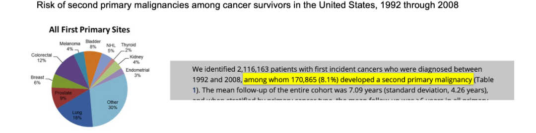 这是一篇“市场分析”,一般用于“忽悠”老板 做肿瘤早筛的都想做全人群。 这无可厚非,历史上Exact Sciences也给我们展现了充分的证据——在“仅仅”拓展了5岁的适用年龄后,销量就迅速起飞了。 但,路都是一步一步走的。 有一个问题绕不过去:什么人群是肿瘤早筛的“初舞台”? 刚接触市场分析的时候听到的第一个行业黑话叫“易肥大”。 “容易拿到、目标人群富集/可转化比例高、市场广阔” 今天顺着这个思路聊聊“肿瘤幸存者”群体。 通常,如果是给老板的PPT,都会先从市场规模讲起——无它,这样比较好“骗”预算。 但今天都是自己人,所以我们换个顺序 这个人群要能回答三个问题: 1. “你”好做吗? 2. “人”愿做吗? 3. “能”做多大? 各位老板,准备好了吗?咱们开始~ PS:本文引用资料均来自公开渠道,个人观点仅供参考。 01 “你”好做吗? 单独为细分市场开发产品是不划算的,讲究一个用现成的。 而对于一个性能固定的筛查产品,发病率是实际性能的关键: 发病率越高,PPV和NPV都越好看 因此要得出“yes”的结论,需要两层答案:发病率、实际性能 1. 发病率足够“高” 肿瘤早筛的需求与发病率有着密切的关联。 而在肿瘤幸存者身上,如果只是原位复发,可能MRD是更好的选择。 那么,肿瘤幸存者出现新原发肿瘤的概率有多大? 我找到了一篇发表在2016年发表在Cancer上的meta分析: 在美国1992-2008年期间确诊的212万成年(>18岁)肿瘤患者中(限定10种肿瘤,且排除了原位复发和一年内新发),有8.1%(共计17万)人出现了新发肿瘤。其中最常见的新发是肺癌(18%)、结直肠癌(12%)、前列腺癌(9%)和膀胱癌(8%)。 而2015-2019年美国癌症的年龄标准化发病率(ASIR)为449.4/10万,大约0.45%。 这是接近20倍的差距。 虽然这个直接对比是不精准的——前者并未涵盖所有肿瘤且二者年龄段并不完全匹配——但“发病率存在倍数差”应该是个非常确定的结论。 2. 性能足够“好” 这里要请出老演员Grail,这次的ASCO大哥颇为低调,但恰好有一个poster就聊到了MCED在肿瘤幸存者中的性能: 队列是从PATHFINDER中拆出来的一个人群,1609名无症状肿瘤幸存者。 用目前商业化版本的Galleri做检测,找出了9个真阳: