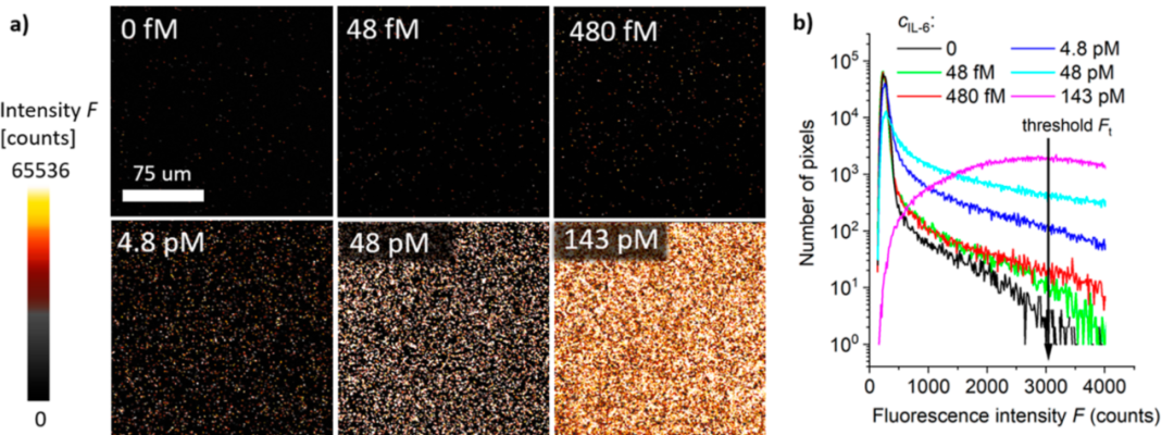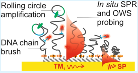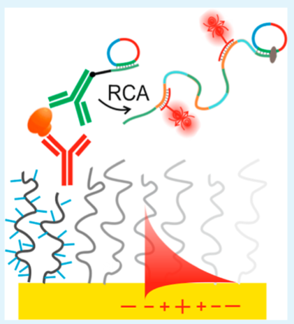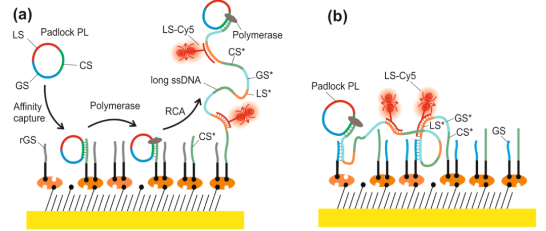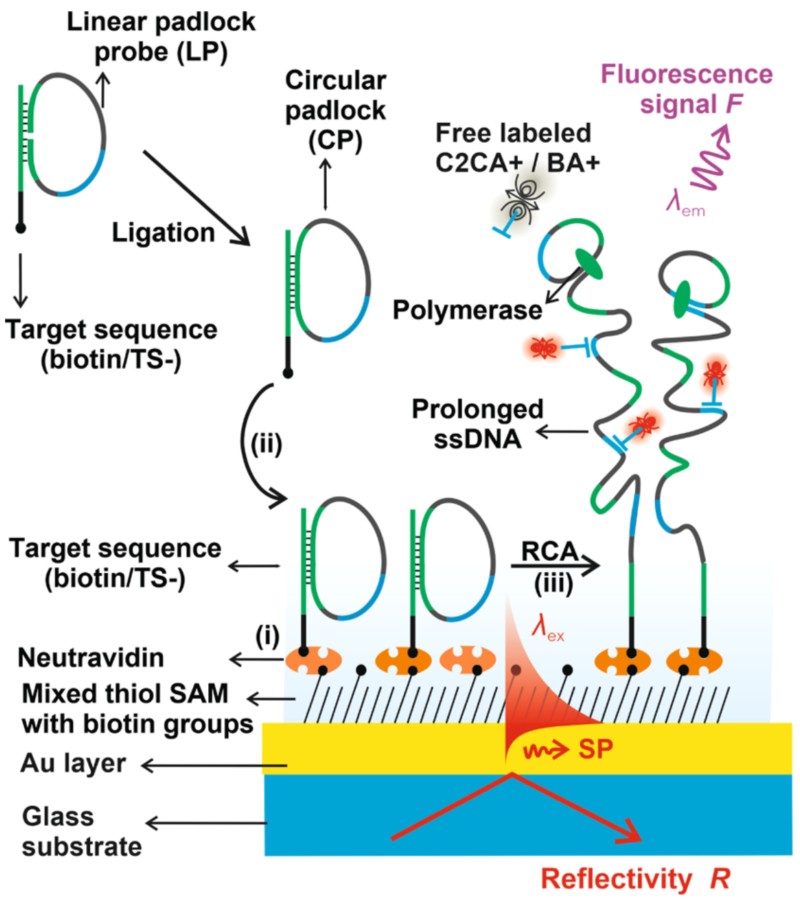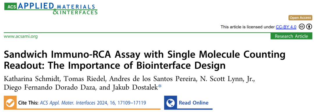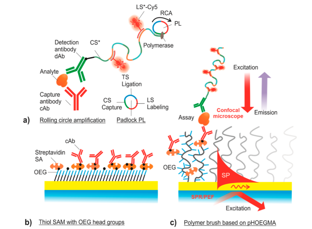 Jakub Dostalek生物传感器研究专家,从2021至2024年,发表在国际著名材料学期刊《ACS Appl Mater Interfaces》上的3篇文章,为我们讲述了一件事,基于RCA扩增原理的信号放大技术如何应用于单分子检测。 与Jakub Dostalek的技术相比,David应用RCA于单分子免疫检测的方法似乎更为简单、直接。只是不知道两者相比效果如何呢?欢迎有兴趣的朋友入群讨论。入群方式见文末。 利用表面等离子体共振和光波导光谱技术 对固相载体上RCA的原位监测 在固体表面部署DNA扩增反应具有通过高效复用等方式扩大DNA分析技术性能的潜力。此外,表面DNA扩增反应可能为适用于检测不同分析物的其他类型传感器模式和分析扩增策略打开了大门,包括无法直接扩增而通常只能通过免疫测定法检测的蛋白质。RCA能够产生密集的单链脱氧核糖核酸(ssDNA)链,形成聚电解质刷层。 利用结合表面等离子体共振(SPR)和光波导光谱(OWS)的倏逝波光学生物传感器,在原位监测表面附着的单链脱氧核糖核酸(ssDNA)链的生长。滚环扩增(RCA)促进ssDNA链的“支链”生长,并通过光学追踪锚固定在金传感器表面的ssDNA链的逐渐延长。 在足够的聚合物链密度下,ssDNA呈现出一个厚度超过10 μm的刷状结构,支持沿金属传感器表面传播的引导光波光谱。利用表面等离子体的受限光场和额外的离域介质光波导模式同时探测该界面,可以精确地原位测量ssDNA刷的厚度、聚合物体积含量和密度梯度。作者首次报道了利用SPR/OWS技术测量固体表面上的RCA速度,可以与散装溶液中的RCA速度进行比较。此外,还讨论了通过改变支链密度和离子强度以及通过与互补短ssDNA钉的亲和反应进行后处理来控制ssDNA刷的性能。这些观察结果可能为基于亲和力的生物传感器对RCA进行敏感和快速的检测提供重要的线索。 等离子体生物传感器量身定制的RCA: 从集成到单分子检测 通过结合SPR和PEF方法,这项工作研究了RCA产生的长单链DNA (ssDNA)链的构象对等离子体传感器响应增强的影响。为了将RCA反应限制在瞬变表面等离子体场内,从而最大限度地提高传感器响应,开发了一个携带分析捕获分子和额外导向ssDNA链(与RCA生成链的重复片段互补)的界面。当使用圆形挂锁探针作为模型目标分析物时,PEF读数表明,与直接标记相比,报告的RCA实施将检测限(LOD)从13 pM提高到高fM浓度。相应的增强因子约为2个数量级,这与所开发的生物界面在瞬时表面等离子场中折叠的RCA链所附着的荧光团发射体的最大数量一致。此外,RCA可以通过荧光显微镜直观显示单个结合事件,从而可以直接计数捕获的分子。这种方法为单分子检测提供了一种快速的数字读出格式,进一步降低了LOD。 对人血清中低丰度蛋白分子的分析,其基础是对固体传感器表面上单个亲和捕获的分析物进行计数,从而产生类似于数字检测的读出格式。该方法采用滚动环扩增(RCA)的夹心免疫分析方法,通过将目标分析物与荧光显微镜观察到的空间上不同的亮点相结合,进行单分子检测(SMD)。目标分析物和其他免疫测定成分与传感器表面的非特异性相互作用在本工作中特别重要,因为它最终限制了该测定的性能。通过设计各自的生物界面和巯基自组装单层与寡聚乙烯(OEG)头部基团,以及聚[寡聚(乙二醇)甲基丙烯酸酯](pHOEGMA)抗污聚合物刷用于在传感器表面固定捕获抗体(cAb),使其最小化。结合表面等离子体共振和表面等离子体增强的荧光监测反应动力学,建立了基于RCA接枝的长单链DNA的荧光后标记的检测方法。这些技术被用于原位测量cAb与传感器表面的结合,短单链DNA标记到dAb,从分析的液体样品中捕获目标分析物,以及RCA产物的荧光读数。 通过调整抗污生物界面,优化共轭化学,以及实现dAb与传感器表面之间的弱库仑排斥,该方法的检测限(LOD)得到了大幅提高。对于所选的白细胞介素- 6生物标志物,对模型(加标)样本进行了SMD检测,LOD浓度为4.3 fM,并验证了对标准人血清样本的检测能力。 在固体传感器表面进行了三明治免疫RCA的实验,用于单分子水平的蛋白质分析物的检测。通过结合SPR和PEF装置,实时监测生物分子在表面的附着和长ssDNA链的RCA生长,并行测量表面质量密度变化和与荧光团标记分子结合到表面相关的荧光信号。这两种读出模式对发生在非常接近表面的变化很敏感,这是通过共振激发表面等离子体波的受限电磁场(到一个约100 nm的距离)来探测的。 RCA产物的存在表现为荧光强度增加,来源于Cy5-LS标记的ssDNA链与亲和捕获的IL-6分析物连接。成像显示,当目标IL-6分子从低(fM和低pM)浓度的溶液中被捕获时,可归因于单个扩增事件。对于较高的IL-6浓度c > 48 pM,表面可容纳未分离的明亮区域。应该注意的是,对传感器表面的单个IL-6分子进行成像的能力并不意味着报告的概念允许检测分析溶液中分析物的单个拷贝。 杭州乐为科技有限公司 推出抗体寡核苷酸偶联试剂盒助力您轻松实现抗体寡核苷酸的高效偶联,加速您的科学研究与项目推进。 欢迎来电咨询,微信同号。 技术联系电话:18611591243 销售联系方式:19957893538 公众号已建立免疫PCR技术交流群,扫下方二维码+小编微信后邀请入群(验证时请报备信息:姓名、工作单位、职务)。关于免疫PCR技术研究的问题,大家可以随时群内沟通,共同进步。 |