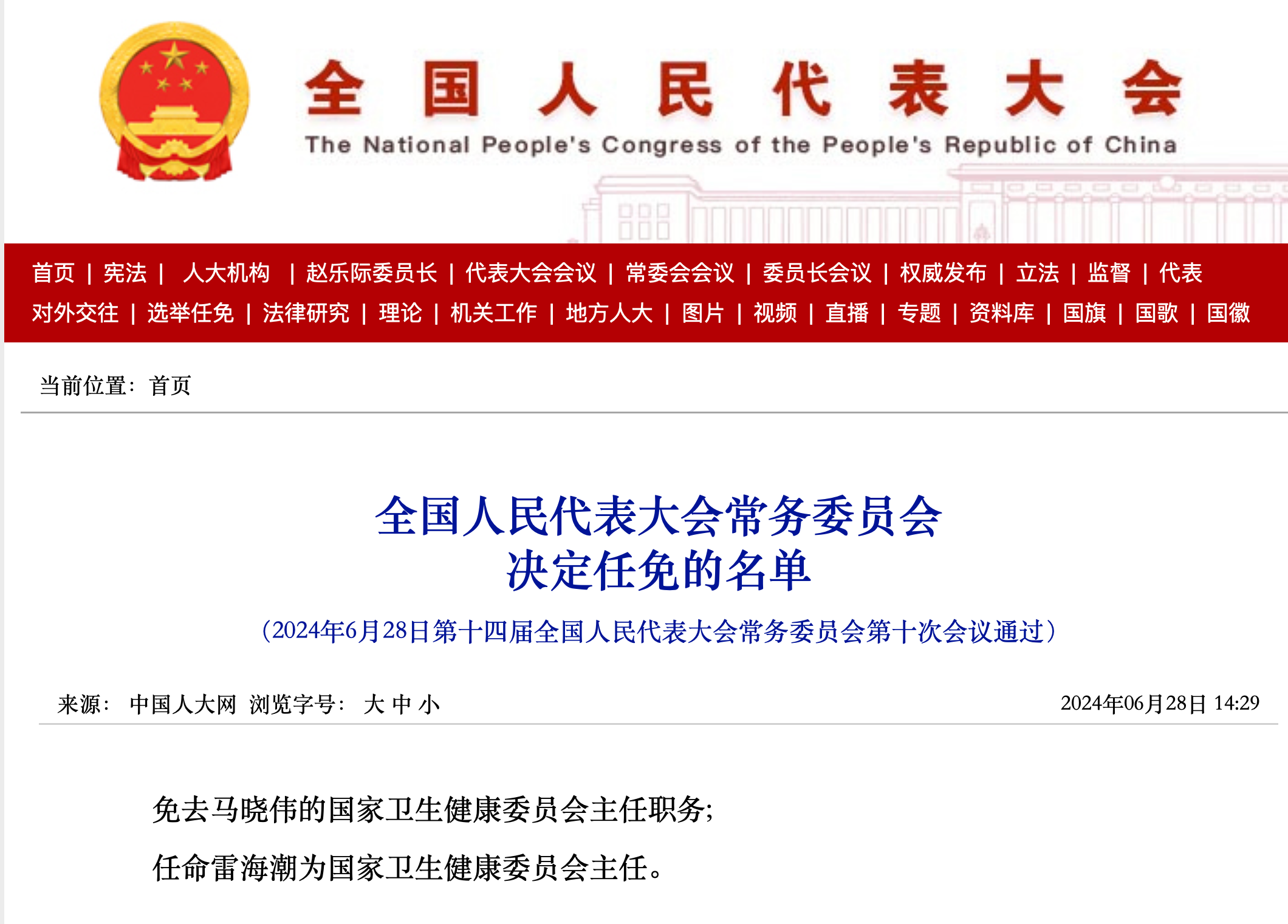 雷海潮任国家卫生健康委主任