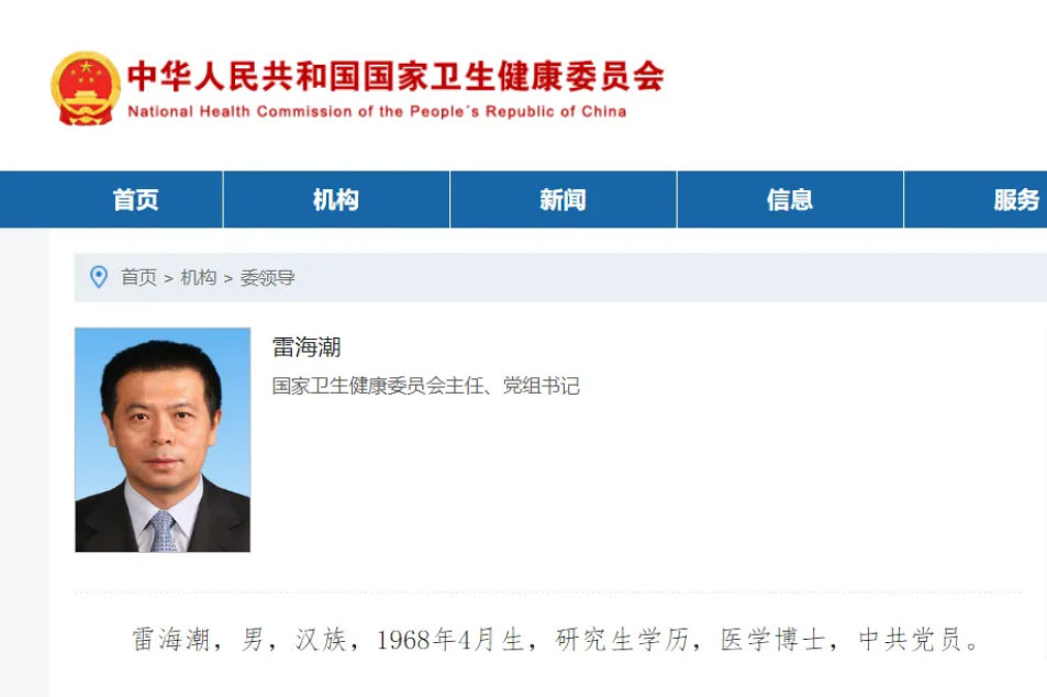 雷海潮任国家卫生健康委员会主任