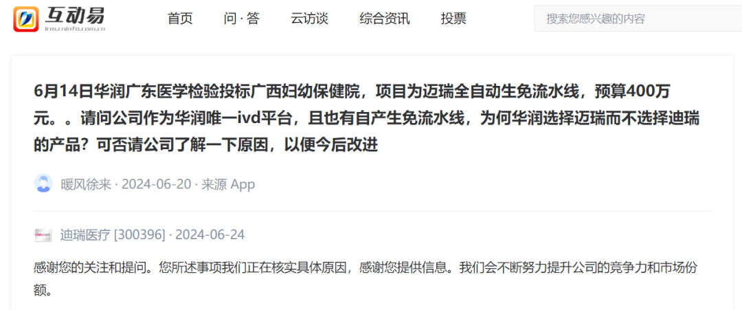 6月24日消息,有投资者在互动平台向迪瑞医疗提问:6月14日华润广东医学检验投标广西妇幼保健院,项目为迈瑞全自动生免流水线,预算400万元。请问公司作为华润唯一IVD平台,且也有自产生免流水线,为何华润选择迈瑞而不选择迪瑞的产品?可否请公司了解一下原因,以便今后改进。