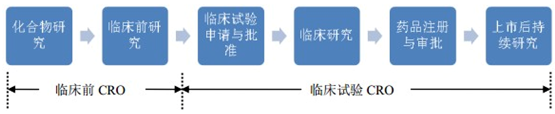 CRO企业分为临床前CRO和临床试验CRO两大主要类别,目前临床前CRO主要从事化合物研究服务和临床前研究服务,其中化合物研究服务包括调研、先导化合物和活性药物中间体的合成及工艺开发;临床前研究服务包括药代动力学、药理毒理学、动物模型等。