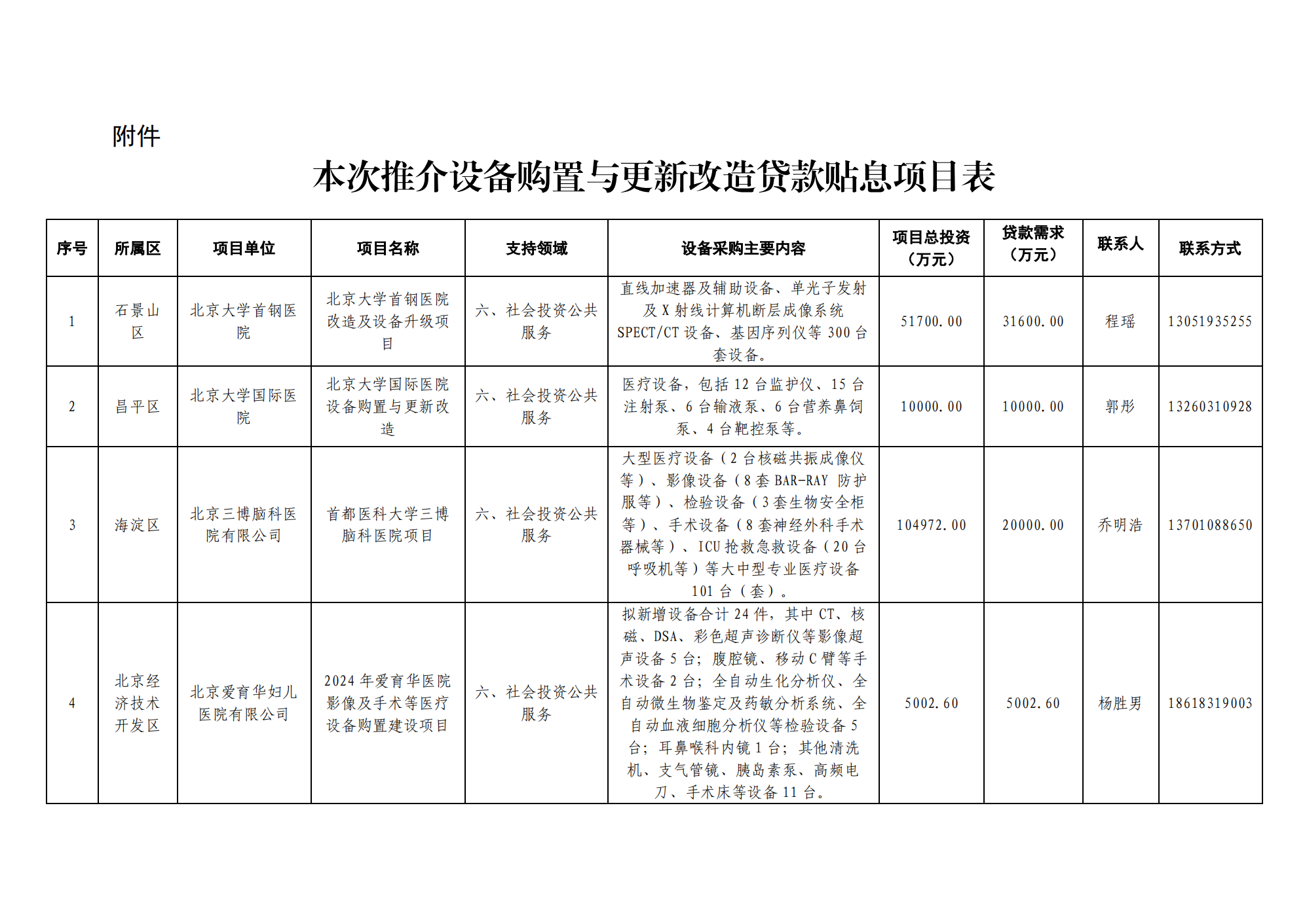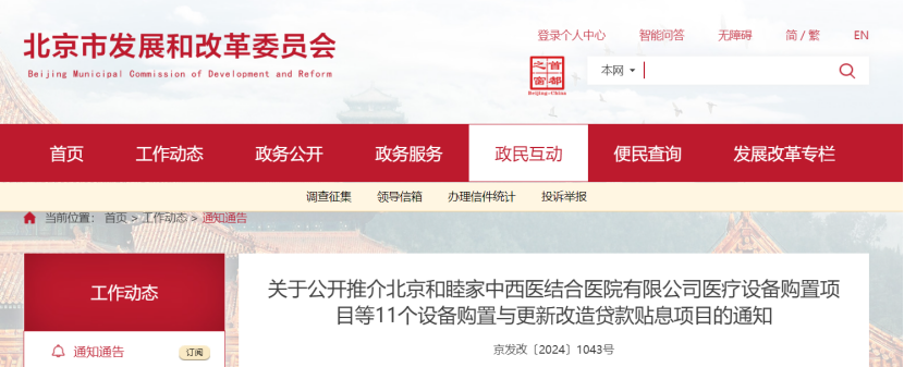 近日,北京发改委发布《关于公开推介北京和睦家中西医结合医院有限公司医疗设备购置项目等11个设备购置与更新改造贷款贴息项目的通知》。