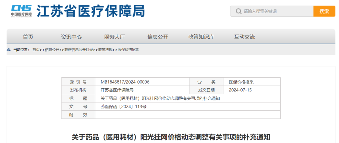 7月15日,江苏省医保局发布通知,关于药品(医用耗材)阳光挂网价格动态调整有关事项的补充通知。这是自6月20日发布关于进一步推进医用耗材阳光挂网价格治理工作的通知后的第一次补充。