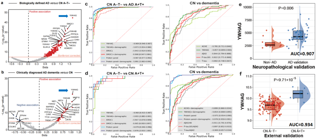 近日,复旦大学附属华山医院神经内科郁金泰教授团队领衔,联合复旦大学类脑智能科学与技术研究院冯建峰/程炜团队运用人工智能驱动的医学研究创新思路和分析策略,纳入了认知正常、轻度认知障碍和阿尔茨海默病共707名参与者,对迄今为止最大规模的高通量脑脊液蛋白质组学(6361种蛋白)数据进行分析建模,最终发现了对阿尔茨海默病诊断和预测具有重要价值的新型生物标志物——YWHAG。其诊断的精准性能已在独立外部队列及尸检病理队列中均获得验证,甚至优于经典的阿尔茨海默病脑脊液核心生物标志物,有较高的临床应用价值。该项研究成果(7月10日)发表在国际学术期刊《自然-人类行为》(Nat Hum Behav,IF:21.4)杂志上。 郁金泰教授介绍,近年来,针对β淀粉样蛋白的疾病修饰治疗取得了重大进展,越来越多的阿尔茨海默病靶向精准治疗药物获批上市,为早期患者提供了新的精准治疗选择,但这些新药主要在早期阿尔茨海默病患者中发挥药效,因此准确识别早期患者至关重要。早期诊断是实现精准治疗的关键,这对现有的诊断方法提出了前所未有的高要求。其次,由于这些新药价格昂贵且仍存在一定风险,进一步改进诊断技术以确保药物的有效应用显得更加紧迫。 于是,郁金泰教授团队运用人工智能驱动的医学研究,采用创新的数据驱动方法和独特的蛋白质组学分析策略,对6361种脑脊液蛋白组学数据进行了分析和建模,通过对平台检测的脑脊液蛋白质组学数据进行深入分析挖掘,在6361个蛋白质中筛选出对阿尔茨海默病生物学诊断和临床诊断最重要的生物标志物,并分为YWHAG、SMOC1、TMOD2和PIGR的四个蛋白组合和ACHE、YWHAG、PCSK1、MMP10和IRF1的五个蛋白组合。 与对照组相比,脑脊液YWHAG无论是在生物学定义的阿尔茨海默病组,还是在临床诊断的阿尔茨海默病痴呆组,其差异表达均最显著。单独YWHAG、SMOC1和TMOD2以及上述四个蛋白组合和五个蛋白组合对生物学和临床定义的阿尔茨海默病均表现出良好的诊断性能。 在单个蛋白中,YWHAG在识别生物学定义的阿尔茨海默病和临床诊断的阿尔茨海默病痴呆时表现最佳,准确度分别高达96.9%和85.7%。使用四个蛋白组合和五个蛋白组合进一步将诊断准确性提高到98.7%和97.5%。重要的是,YWHAG、SMOC1、TMOD2和两种蛋白组合的精准性能不仅在独立的外部队列中得到了验证,而且在区分尸检病理证实的阿尔茨海默病与非阿尔茨海默病时也得到了验证,甚至优于三种经典的阿尔茨海默病脑脊液核心标志物,以及这三种经典标志物的组合。除了精准的诊断效能,它们在预测阿尔茨海默病临床进展方面也表现良好,与阿尔茨海默病核心病理和认知能力下降密切相关。 图 脑脊液蛋白对阿尔茨海默病诊断的准确度及外部队列验证和尸检病理验证结果 据悉,该研究成果不仅为阿尔茨海默病的早期诊断和疾病预测提供了全新的生物标志物,更在临床应用和未来研究方面展现了广阔的前景,且突破了传统阿尔茨海默病诊断标志物的局限性,还显著提高了诊断的准确度。如此高的诊断准确性,有望大幅提高阿尔茨海默病患者的早期识别,进而优化治疗方案,延缓疾病进展,改善患者生活质量。相关成果已申请专利,具有巨大的应用空间和市场转化潜力。 论文链接 https://www.nature.com/articles/s41562-024-01924-6 |