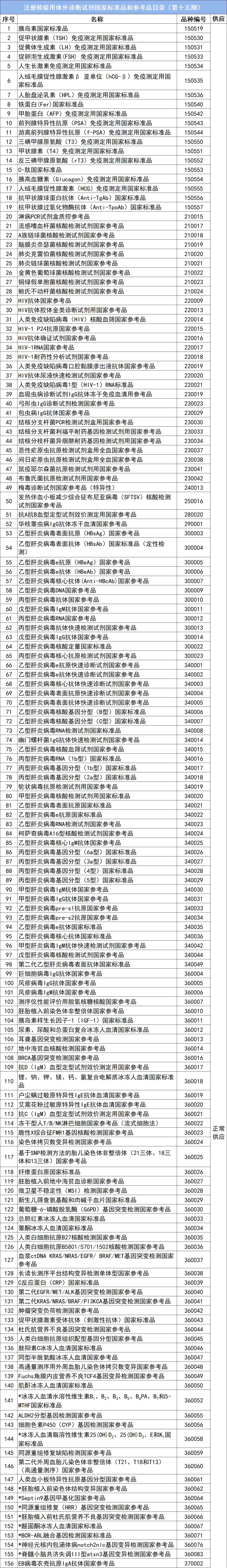 为配合《体外诊断试剂注册与备案管理办法》(国家市场监督管理总局令第48号)的实施执行,经各方共同努力,在注册检验用体外诊断试剂国家标准品和参考品目录(第十五期)的基础上,新增11个品种,现将238个品种公布如下。 注: 1.*标识品种为本期目录新增体外诊断试剂标准物质。 2.▲标识品种为可用于体外诊断试剂检验的化学对照品。 3.相关品种电子版说明书可到中国食品药品检定研究院网站http://aoc.nifdc.org.cn/sell/home/search.html,点击目录查询,进行在线浏览。4.限制供应是指仅供给相关体外诊断试剂生产企业。5.《注册检验用体外诊断试剂国家标准品和参考品目录(第十五期)》发布之日起,《注册检验用体外诊断试剂国家标准品和参考品目录(第十四期)》同时废止。 |