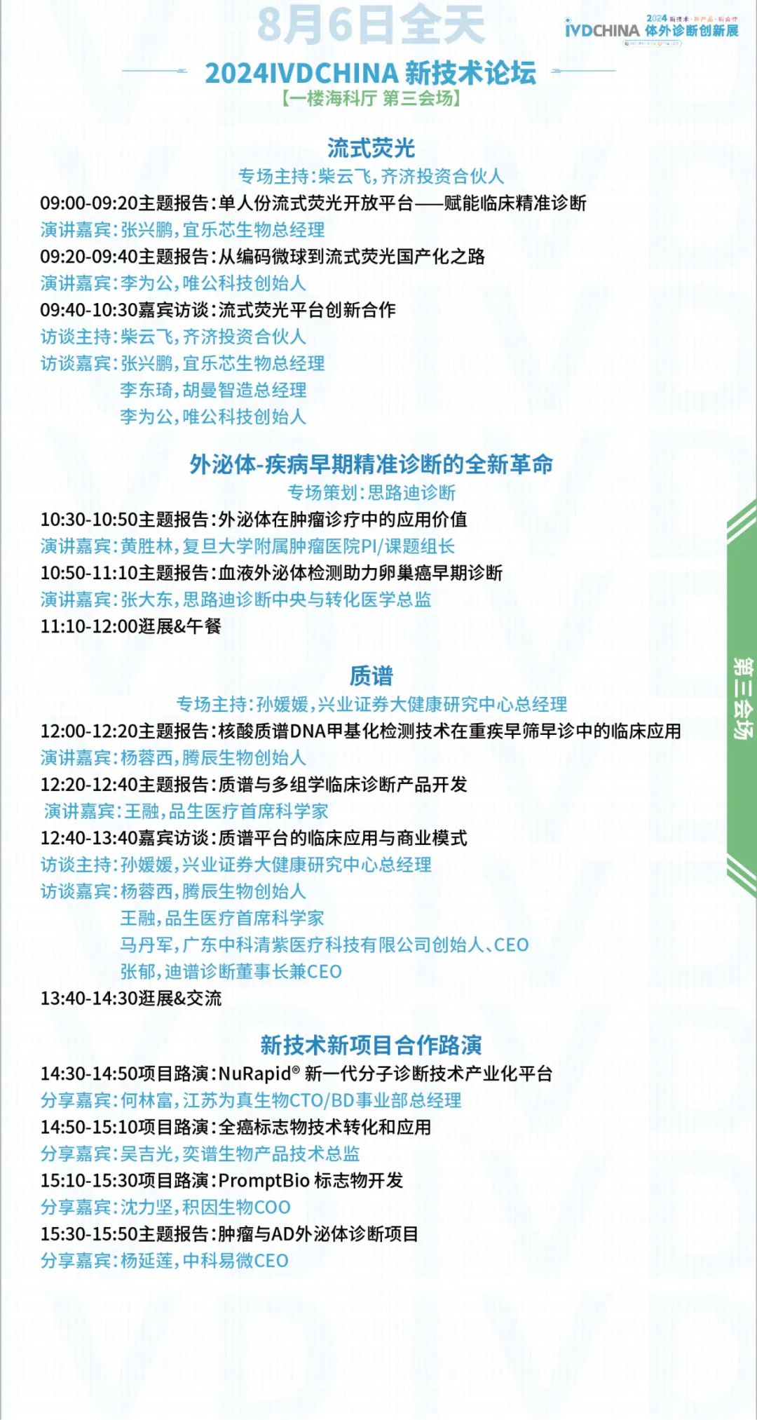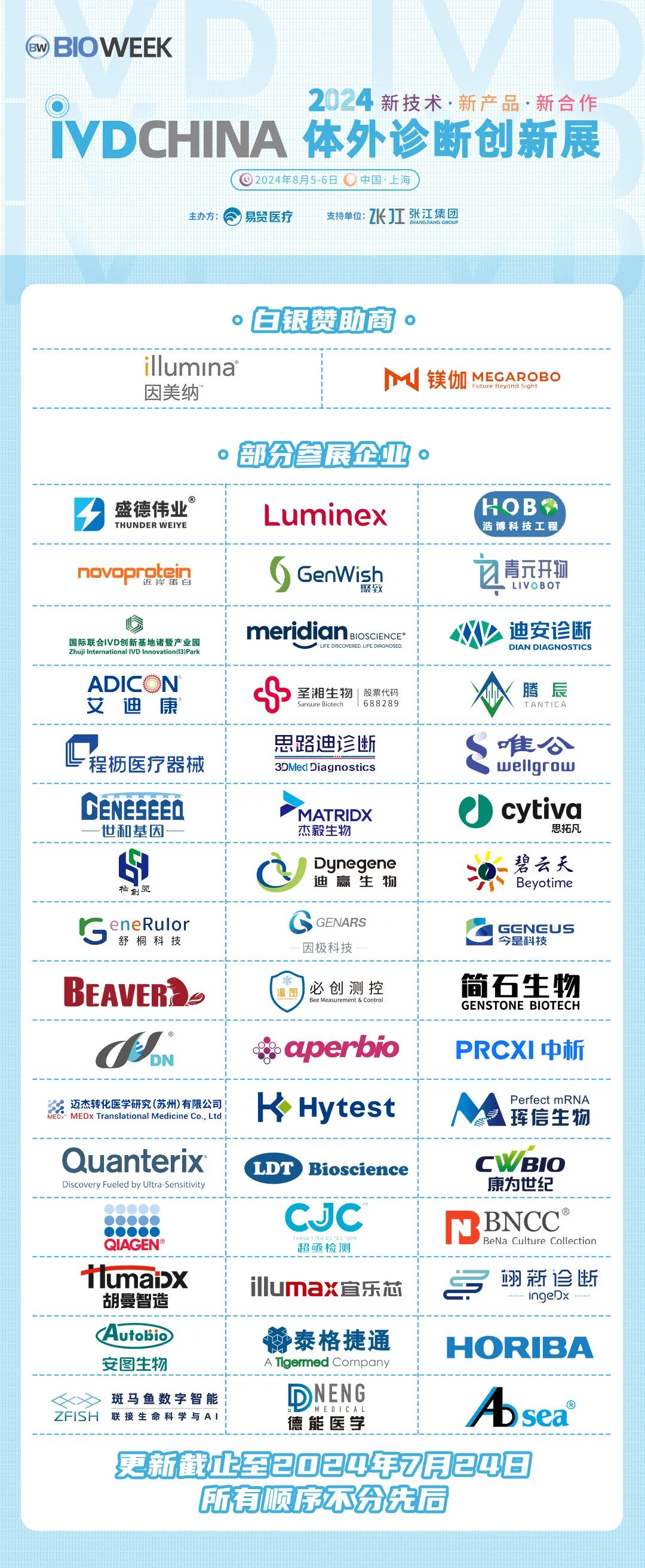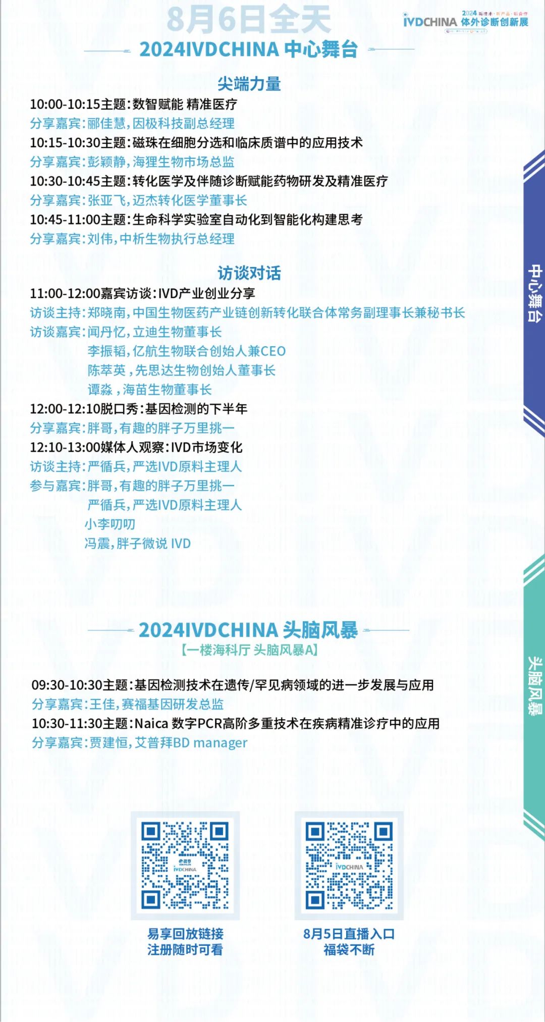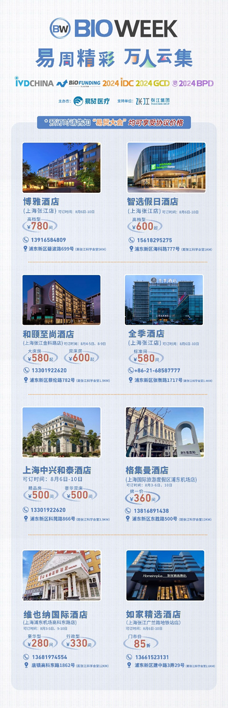 扫码注册大会 参会咨询: @小易诊断13167051807 2024IVDCHINA体外诊断创新展马上就要正式与大家见面啦!展览全程2天(8月5-6日),其中8月5日为开幕日,期待与您现场相见! 签到提醒 01 门票确认 扫描下方二维码,进入个人中心,查看您的签到二维码、门票信息、特邀活动信息。 如您的个人中心页面二维码正常显示且有“未签到”字样,则您的门票注册已生效。 02 签到信息 签到地点:上海张江科学会堂,1楼海科厅前厅 【展商签到】 8月4日 13:00-17:00 【8月5-6日大会与展览】 观众签到: 8月5日 08:00-17:00 8月6日 08:00-15:00 温馨提示:8月5日大会开幕式将于09:00开始 03 资料领取 完成签到后,您可凭代表证领取大会资料(资料有限,先到先得) 04 签到须知 加速入场Tips: 1、 错峰签到:建议您8月4日下午前往上海张江科学会堂一楼海科厅签到,避免8月5日人流拥堵,提前签到更有机会赢取大礼! 2、自助签到:本次大会设有自助签到设备,您可以前往自助签到区操作 05 签到赢好礼 5-6日两天每日早签到,赢取好礼,现场将送出旅行箱、空调毯、玩偶、小易周边等多份好礼,等你来领! 2024IVDCHINA日程 左右滑动查看全日程内容 交通指南 大会地址:上海市张江科学会堂 驾车交通 上海火车站:距离26公里 车程30分钟 上海虹桥火车站:距离40公里 车程40分钟 上海虹桥国际机场:距离37公里 车程40分钟 上海浦东国际机场:距离26公里 车程30分钟 车辆入口: W1号门(可开车驶入地下停车场) 内设地下停车场,收费标准:30分钟免费,超过1小时收费7元,8小时封顶。 地铁交通 地铁13号线学林路3号口,出站后步行600米即可到达 酒店预订 临近会期,我们根据不同价格区间,为大家整理了会场附近的酒店信息,房源紧张,请大家及时预定哦! 下滑浏览完整内容 扫码注册大会 添加@小易诊断 (13167051807) 了解约见及参会服务 部分出席嘉宾 2024IVDCHINA部分参展企业 2024IVDCHINA合作媒体 关于BIOWEEK 由易贸医疗主办,张江集团作为支持单位,联合呈现的BIOWEEK2024将于8月4-10日在上海张江与大家见面,以创新和务实的态度,充分利用上海生物产业资源,和在国际交流中的重要桥梁作用,以技术为出发点,全力打造具有国际影响力的创新技术论坛和展览交流活动。