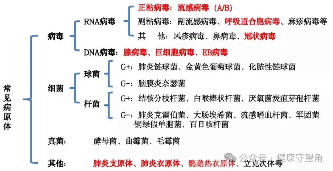 常见呼吸道病原体包括流感病毒、呼吸道合胞病毒、冠状病毒、腺病毒、巨细胞病毒等。