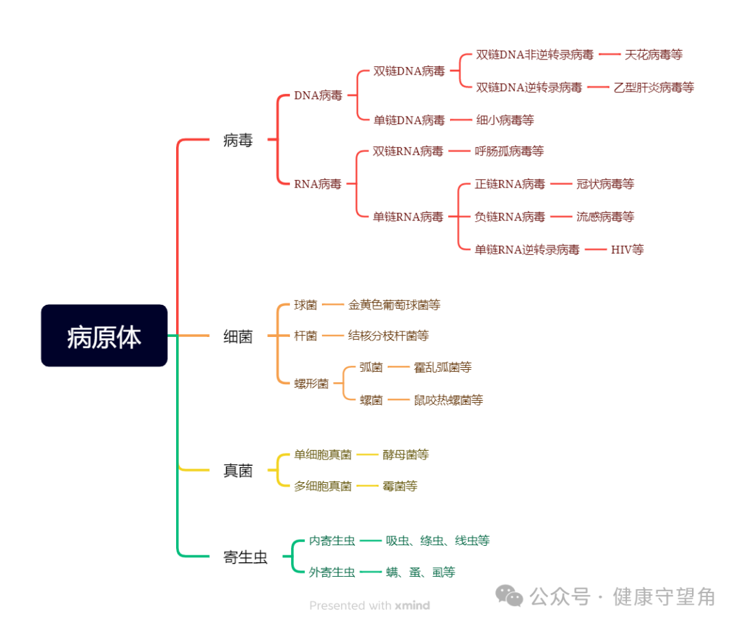 病原体有许多不同种类,包括:细菌、真菌、病毒、寄生虫四类。