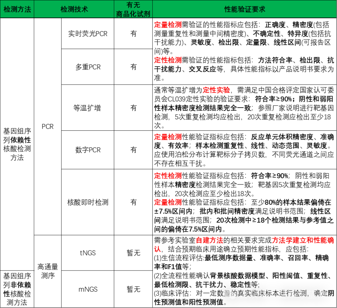 在熟悉不同技术后,就需要我们根据临床实际应用情况选择不同的技术。在确定好技术平台后,我们需要选择合适的仪器和试剂,对选择的仪器和试剂进行方法学验证或者确认,确认合格后才能应用于临床实践。各种方法的具体验证或确认要求参考如下: