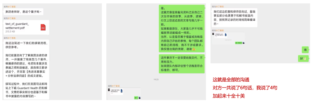 “又不是你家牛马,凭什么给你面子?” 是我利用穿越技能,提前12天“洗稿”了「丁香园」的爆款文章。 对不起! 为了进一步体现诚意,现坦白相关“不检点”事宜如下: 1. 我在2024年7月19日13:07分发了一篇“自认为是原创”的小故事,是对美国一起医疗腐败案件的二次创作,链接如下: 医疗反腐实录:一位医生和他的百万美元宝贝2. 非常巧合,公众号「丁香园」于2024年7月31日20:18分也发表了一篇“自认为是原创”的小故事,链接如下: 一位肿瘤医生和他的销冠女儿:销量暴涨 600% 后,药企自首了3. 鉴于两篇均为基于“原材料”再加工、创作的“故事”,却很“巧合”的在故事结构、叙事逻辑、行文风格、核心内容这四条上高度相似,以我朴素的认知,一定有一方洗稿了,只是不确定谁洗的谁。 4. 为了沟通,在「丁香园」王辉先生的牵线下,我和「丁香园」负责该篇文章的闻雨女士进行了直接的交流。 ——虽然我也不知道为什么明明只有一个人说话,对方却拉了四个人进群,古惑仔看多了吗? 闻女士表示,她100%纯原创: 5. 既然「丁香园」如此笃定,那真相只有一个了: 一定是我在7月19日洗稿了「丁香园」7月31日的文章 作为一名公众号作者,我一向无保留的支持原创保护,不论是抄袭还是洗稿,都是无耻、下流、没底线的行为。 对于此次提前12天洗稿「丁香园」事件,我方深表歉意——抱歉,我会时间穿越的事实瞒不住了。 希望给我个机会,我一定总结教训,下次穿越回去洗稿的时候更加仔细、保证不被看出来。 (—以上为致歉,以下为瞎聊—) 这一次要跳出来,主要是因为: 这篇文章昨天出现在了我文章下面的「推荐」里 伙子们,这是被人骑脸开大啊,士可杀不可辱! 那为什么不跟「丁香园」王先生、闻女士及其团伙掰扯到底? 有两个原因:
